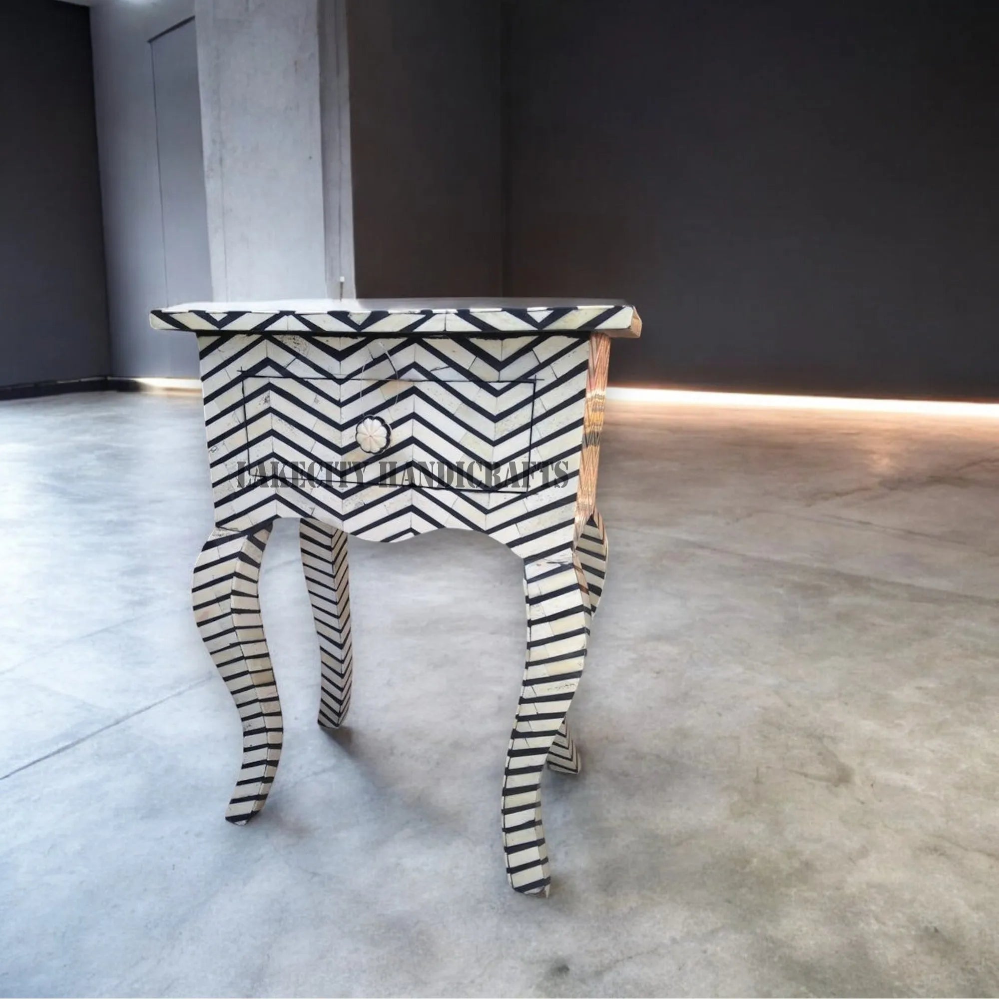 Side tables come in all shapes and sizes, but this black bone inlay side table with curved legs might be the most unique. The four long bowed legs of this side table rise in an elegant curl toward the actual base of the item. There, you’ll find a single drawer capable of housing a number of different items. The space between the legs gives you the ability to store items underneath the table with ease. You’ll also be able to display items on top of this reliably-sourced camel bone inlay.