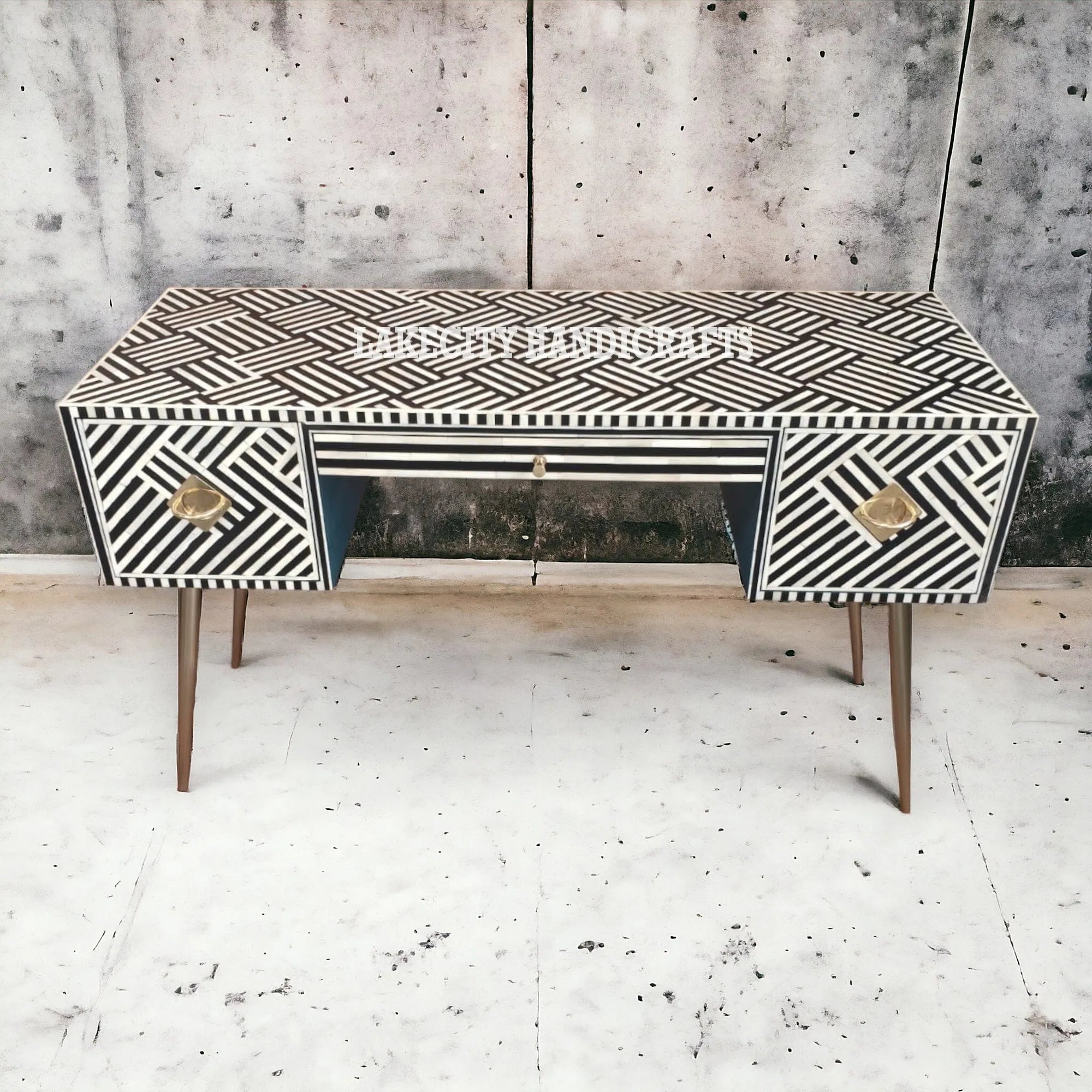 The Optical Bone Inlay Desk in Black is a striking, handcrafted piece featuring intricate bone inlay patterns inspired by Moroccan design. With its bold black color, spacious surface, and sturdy wooden frame, this desk combines functionality and elegance.