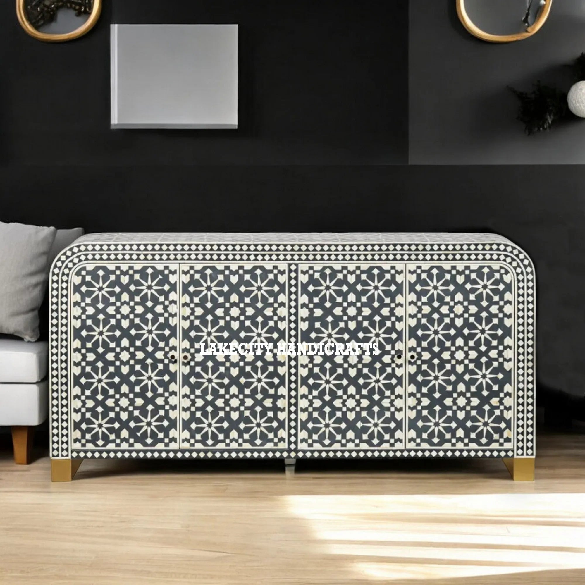 Get your hands on this Beautiful Designer Bone Inlay Buffet that features an waterfall design from the sides. The buffet is adorned with intricate bone inlay work, creating a stunning contrast against the black background. This intricate craftsmanship not only enhances its aesthetic appeal but also showcases the skill and artistry of the artisans who created it.