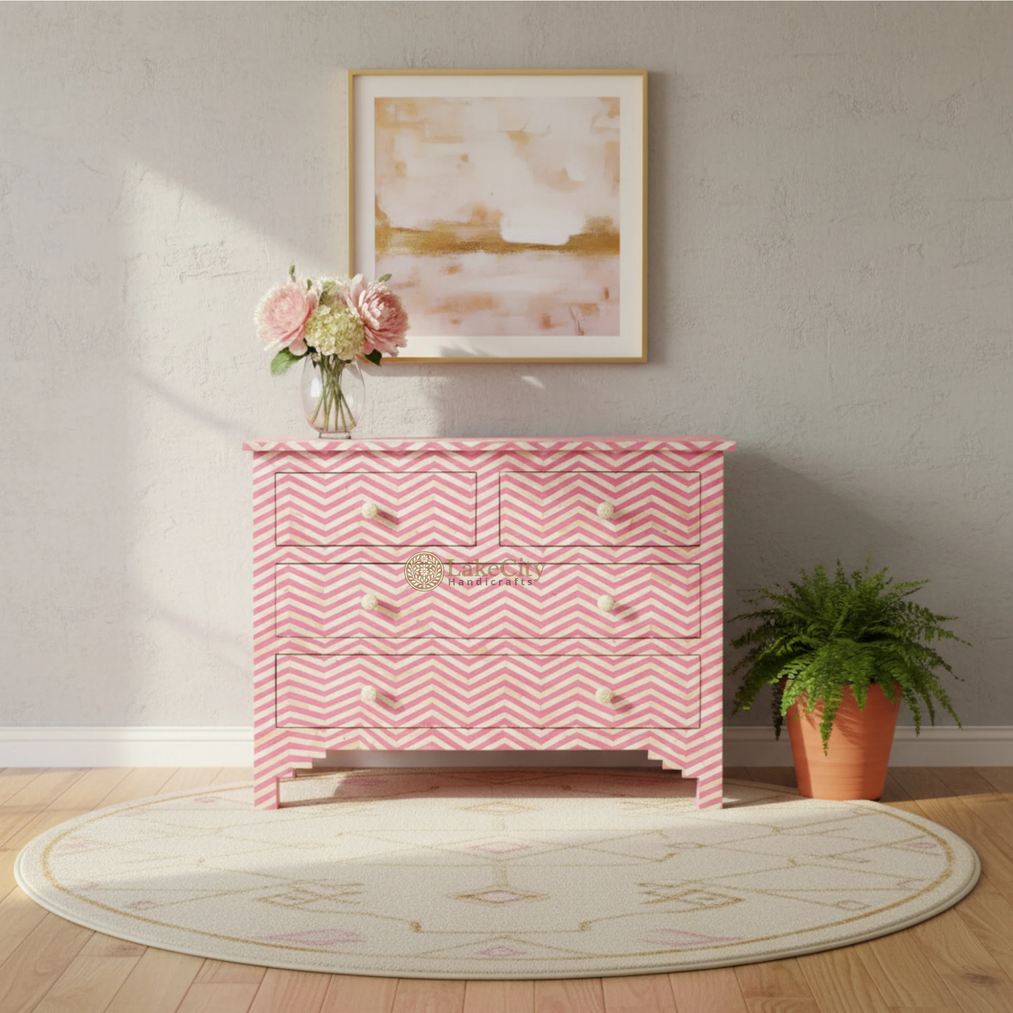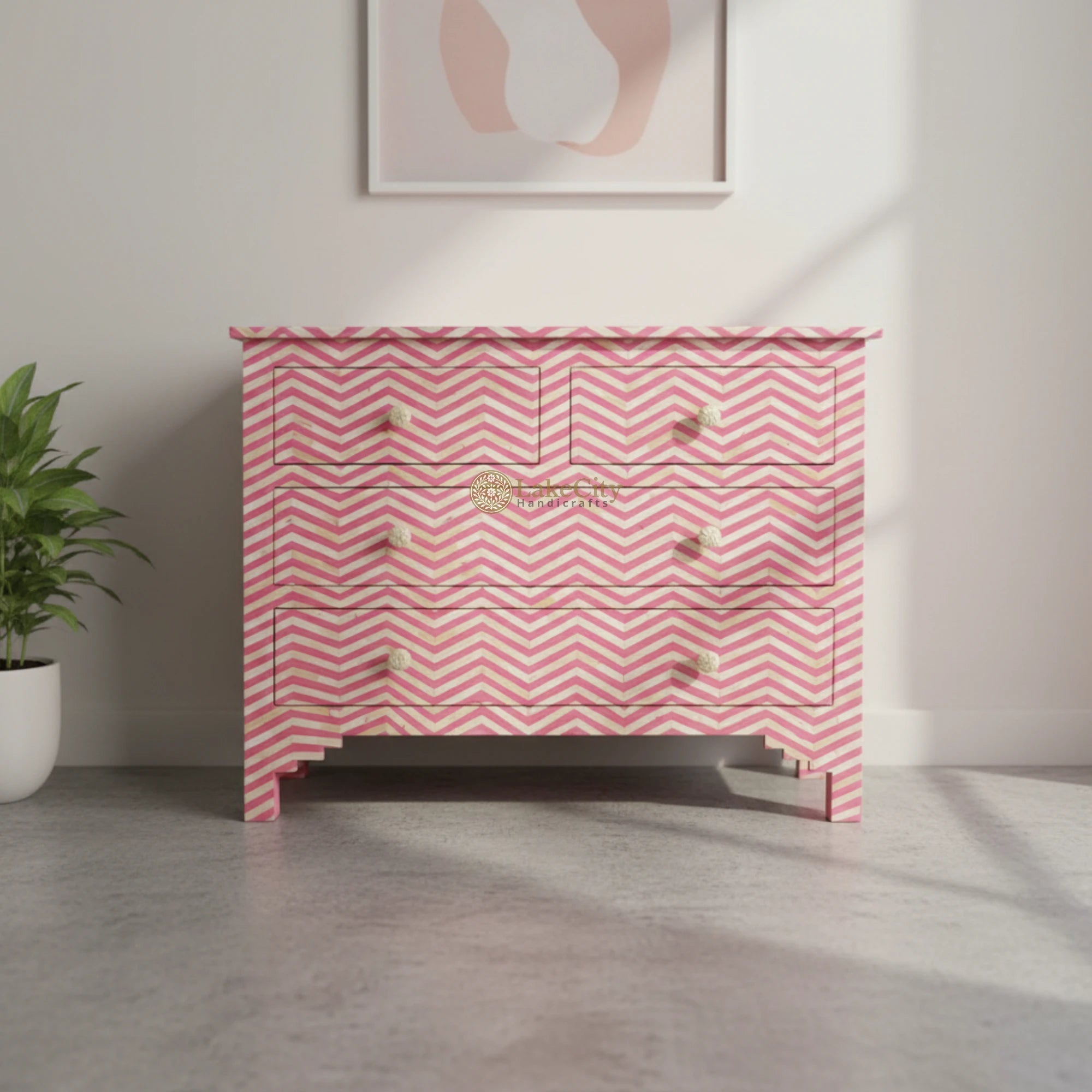 Beautiful design compliments bountiful storage with our bone inlay commode. Four drawer design crafted with bone and resin in a classic chevron pattern, exclusive to Lakecity Handicrafts.