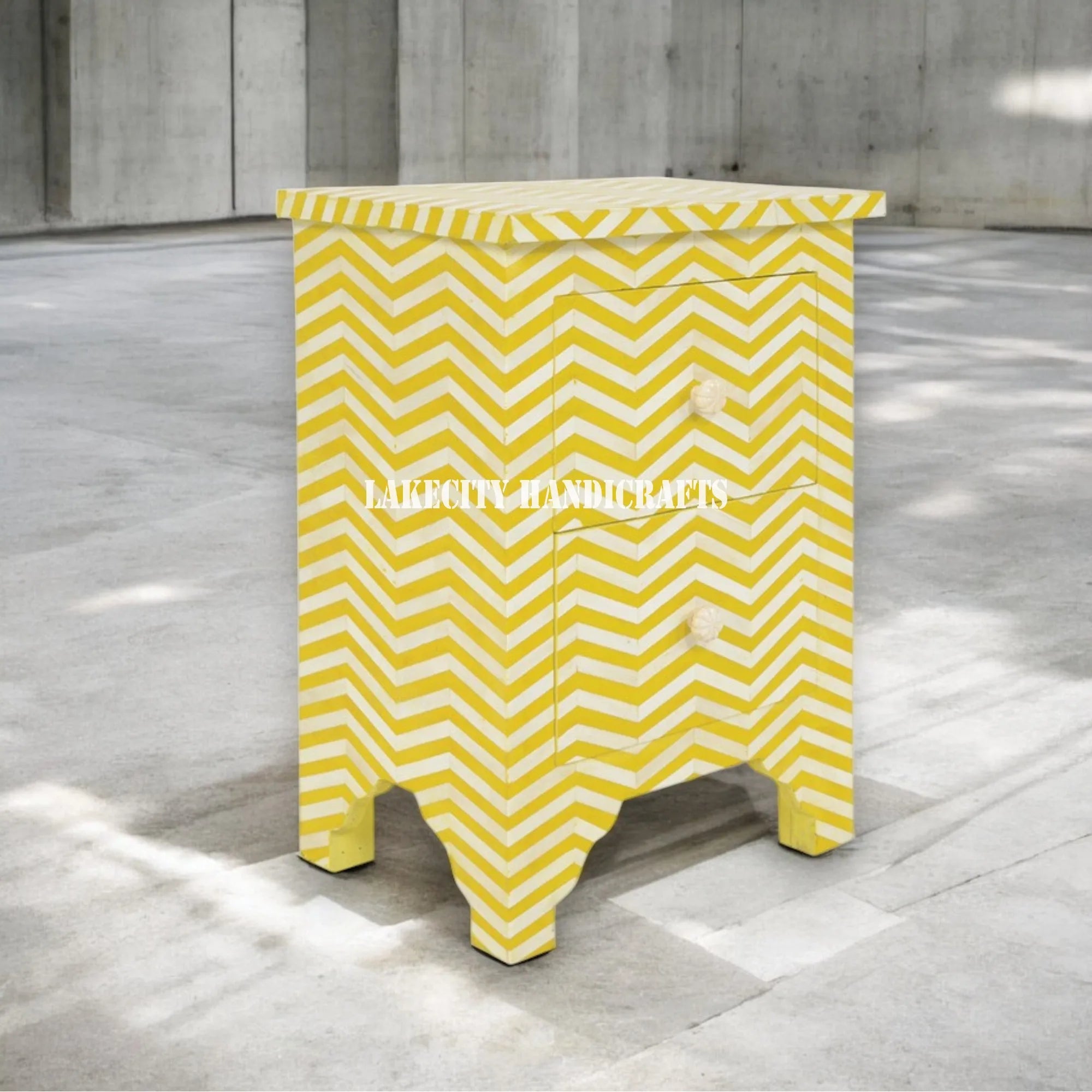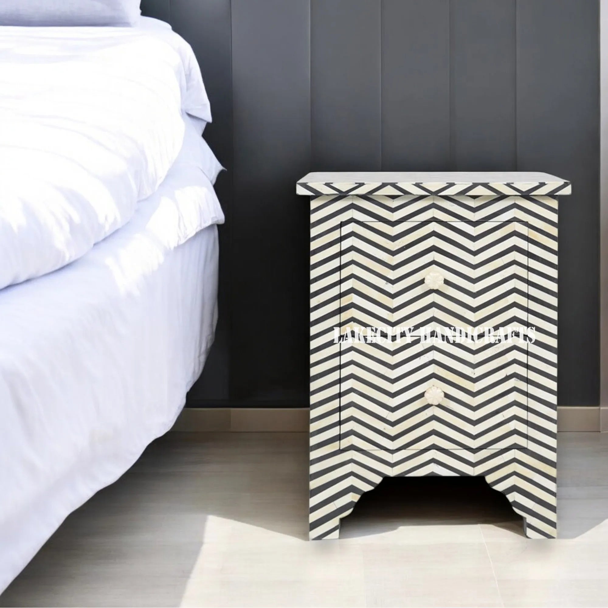 Crafted with charm and unique character, our small two drawer wooden bedside table features a classic chevron pattern exclusive to Lakecity Handicrafts, made up of camel bone and Aqua Colored resin.