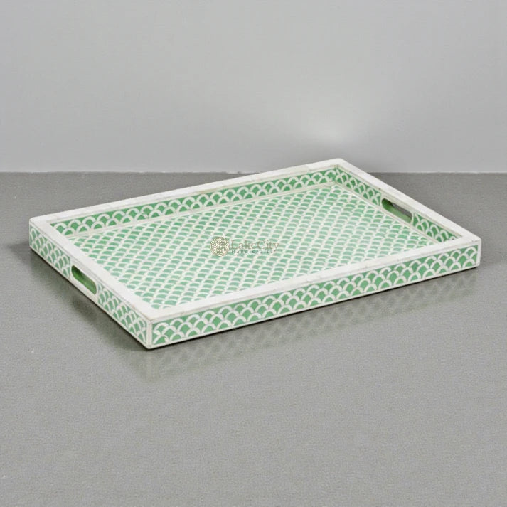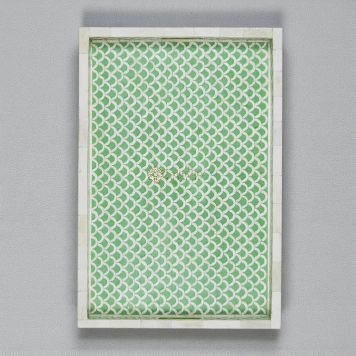 The intricate Fish-scale pattern of this gorgeous tray, featuring bone inlay, was achieved by individually carving pieces and affixing them to a green resin structure within a solid wooden frame.