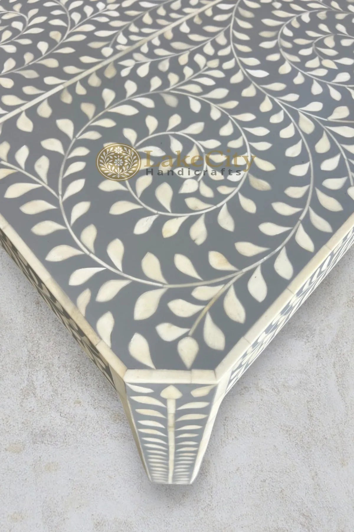 Our coffee table features clipped corners and a beautiful design, highlighting a simplified and updated Indian pattern. Created with painstakingly hand-set bone in resin. The simple structure of the piece allows the craftsmanship to shine while highlighting a worldly sensibility.