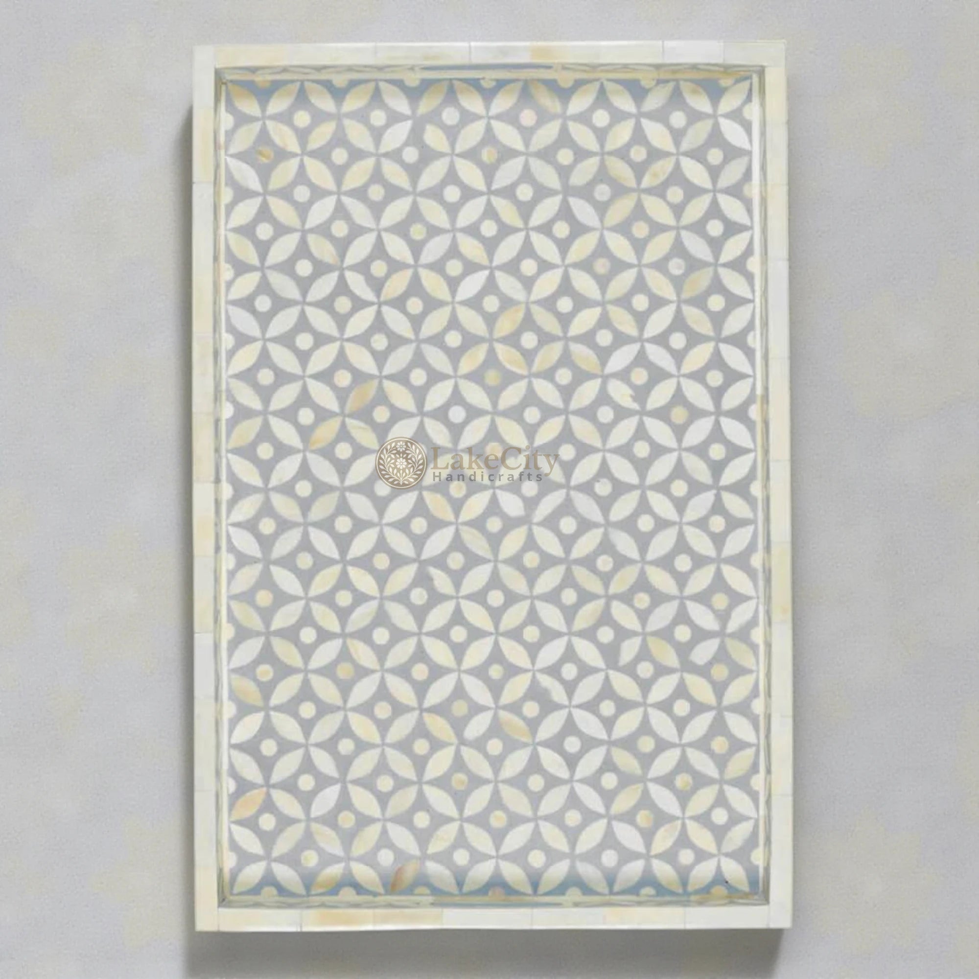 The intricate bone geometric pattern of this gorgeous tray was achieved by individually carving pieces and affixing them into a colorful Resin structured in a solid wooden frame.