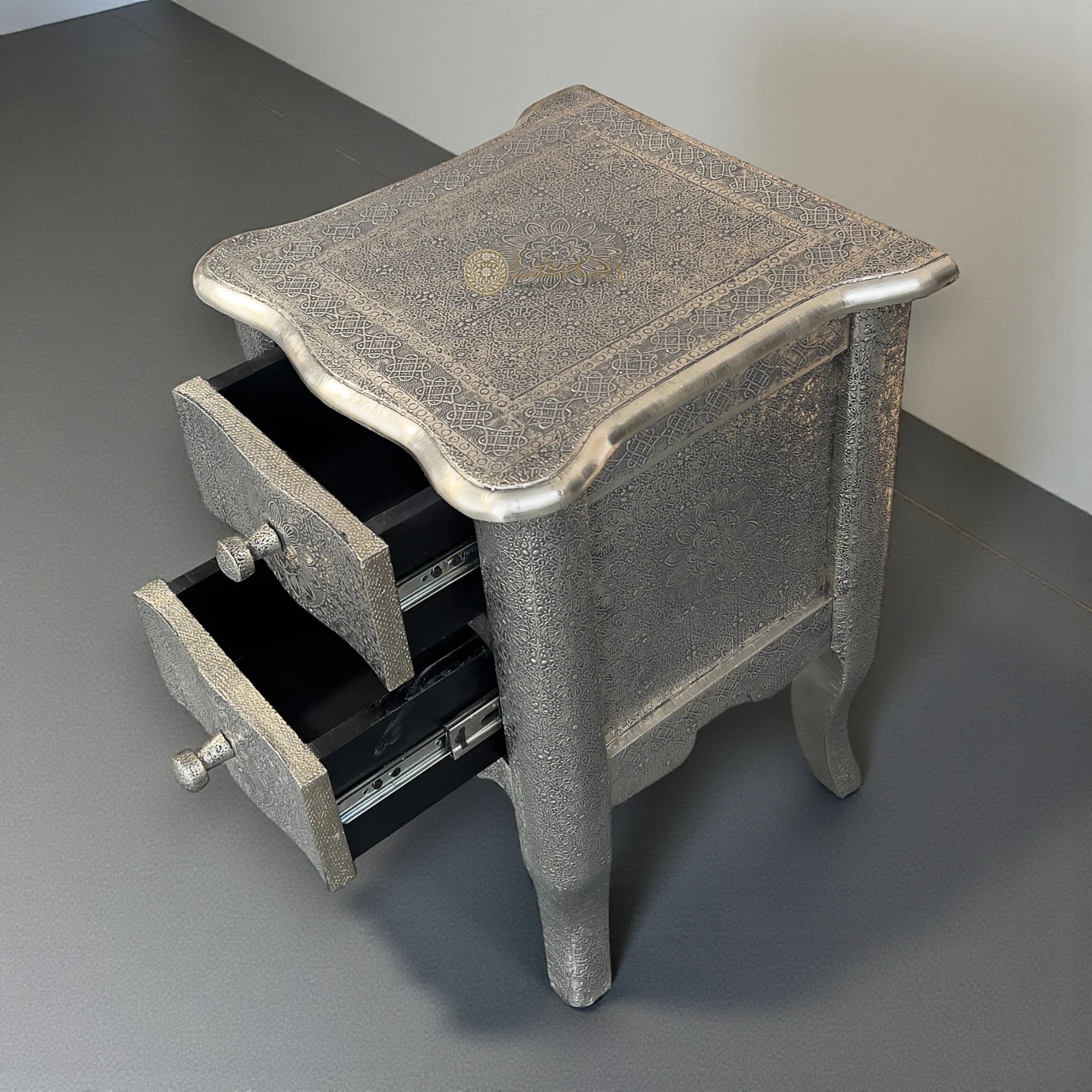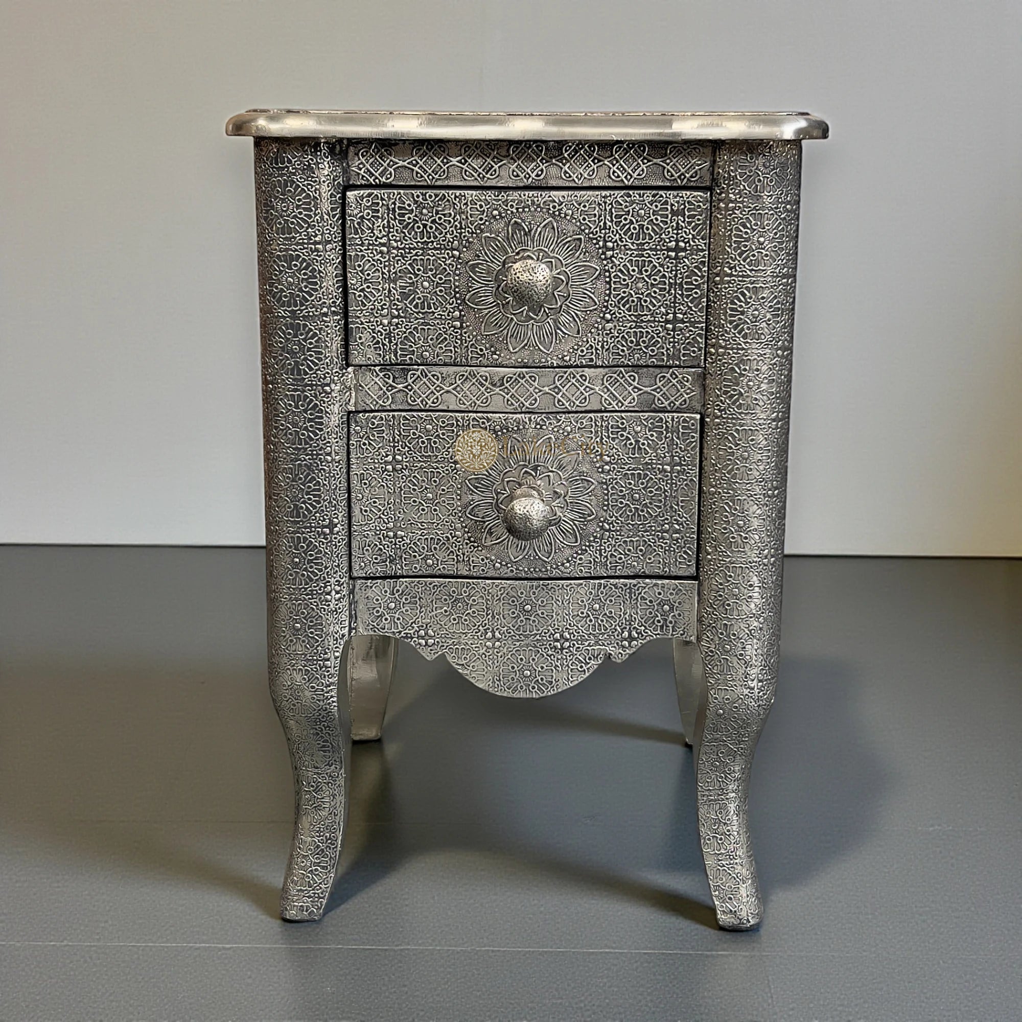 A hand-finished, silver metal-clad surface lends a modern sensibility to this two-drawer nightstand, making it fit for gender-neutral living areas and bedrooms.