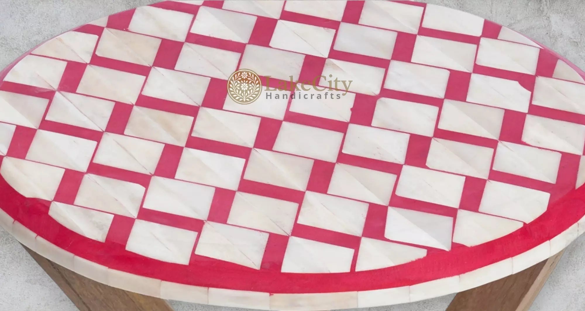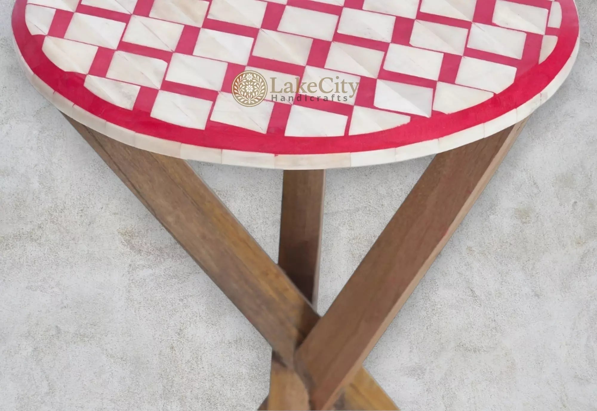 A super awesome side table, featuring the latest Square pattern in bone inlay with red colored resin. It would be perfect as a side table in a colored Living Room or Bedroom. This item comes completely assembled show it off.