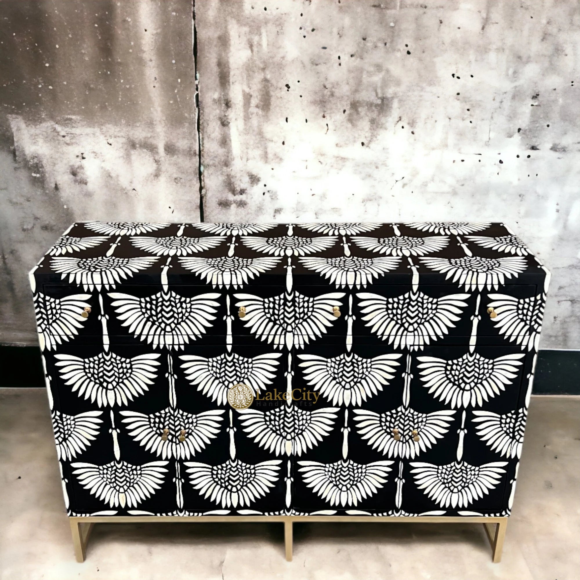 Subtle and Beautiful! A super amazing bone inlay buffet with a swan design. Its intricate bone inlay design adds a touch of sophistication to any space, making it a focal point in a dining room, living room, or hallway. The swan motif adds a whimsical and artistic element to the buffet, creating a sense of gracefulness and beauty.