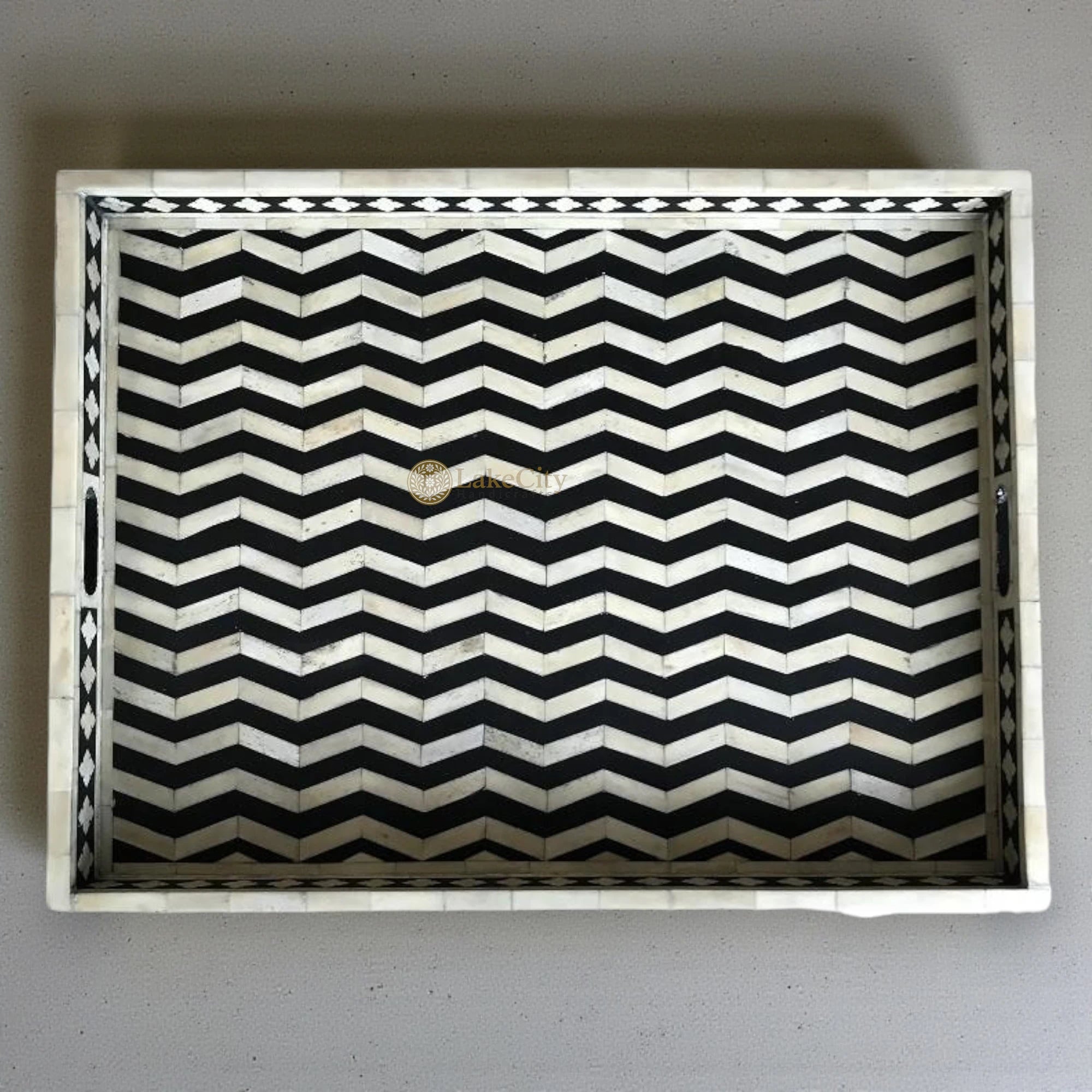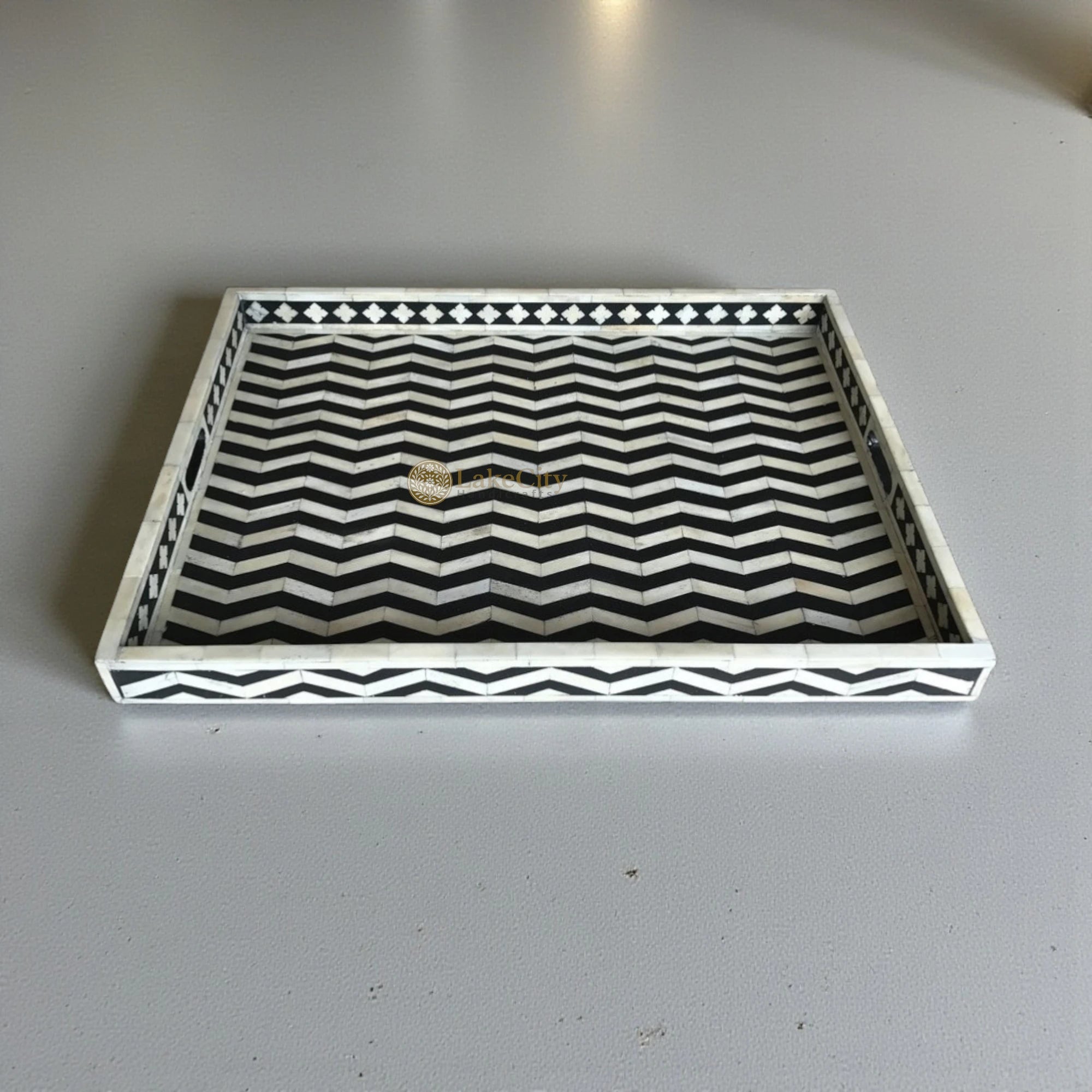 Supremely bold, this fabulous decorative tray is our new favorite thing. Featuring bone-inlay and a black hue, this ottoman tray is right at home on a countertop, vanity, coffee table, or cheeky beverage cart.