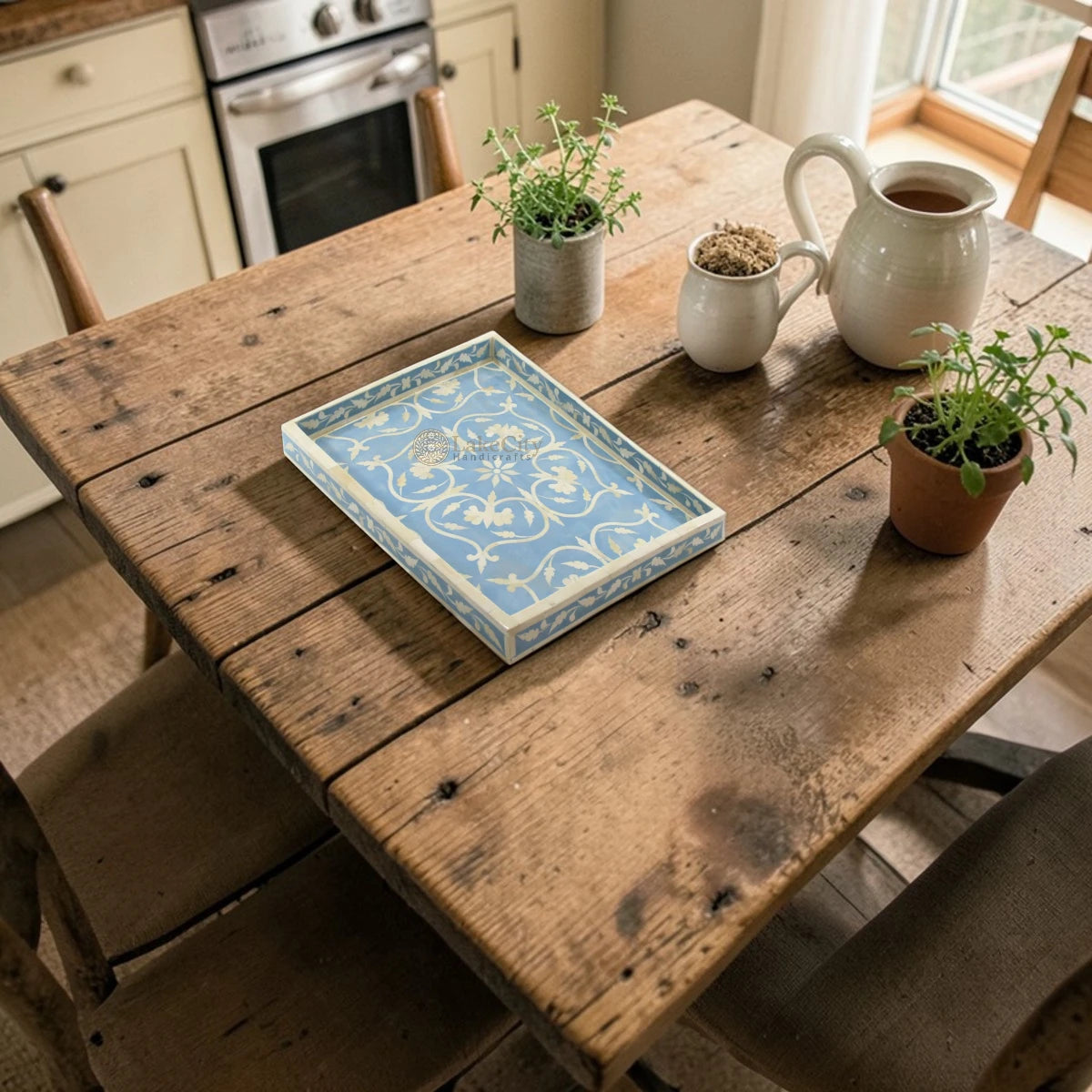 The intricate bone floral pattern of this gorgeous tray was achieved by individually carving pieces and affixing them to a colorful Resin structure set within a solid wooden frame.