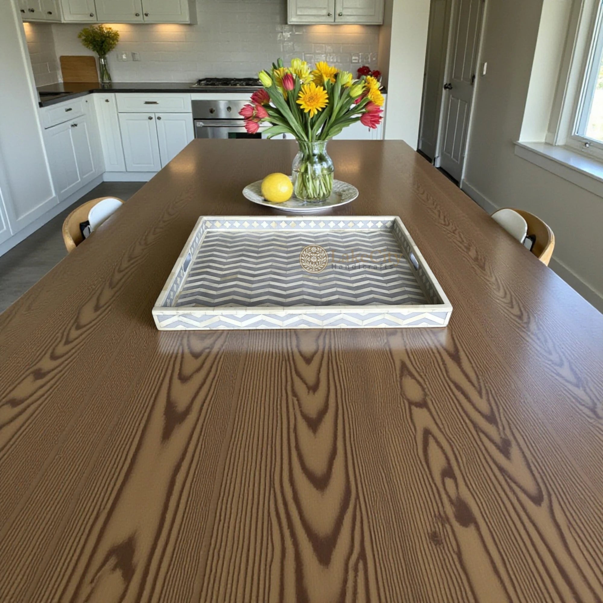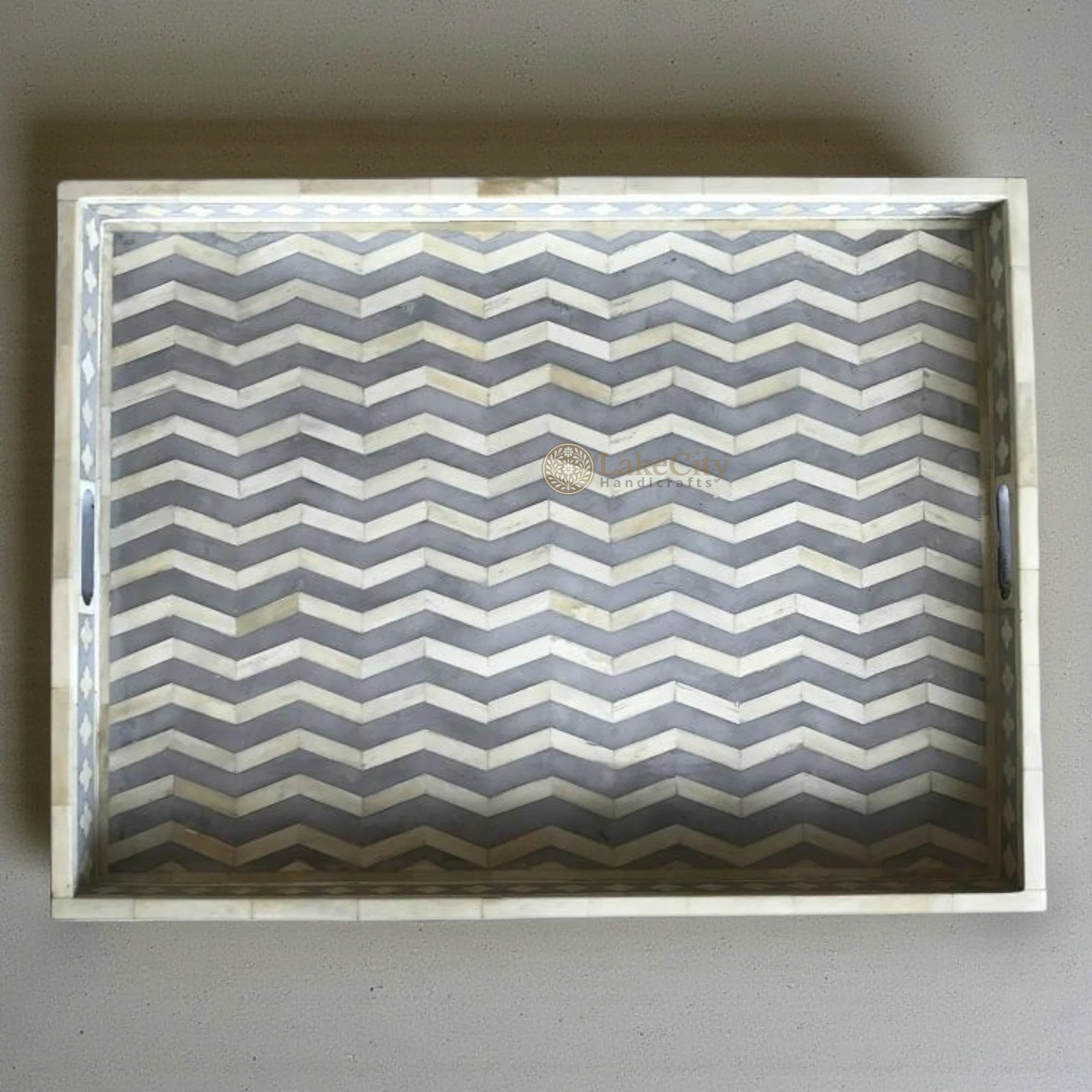 Supremely bold, this fabulous decorative tray is our new favorite thing. Featuring bone-inlay and a grey hue, this ottoman tray is right at home on a countertop, vanity, coffee table, or cheeky beverage cart.