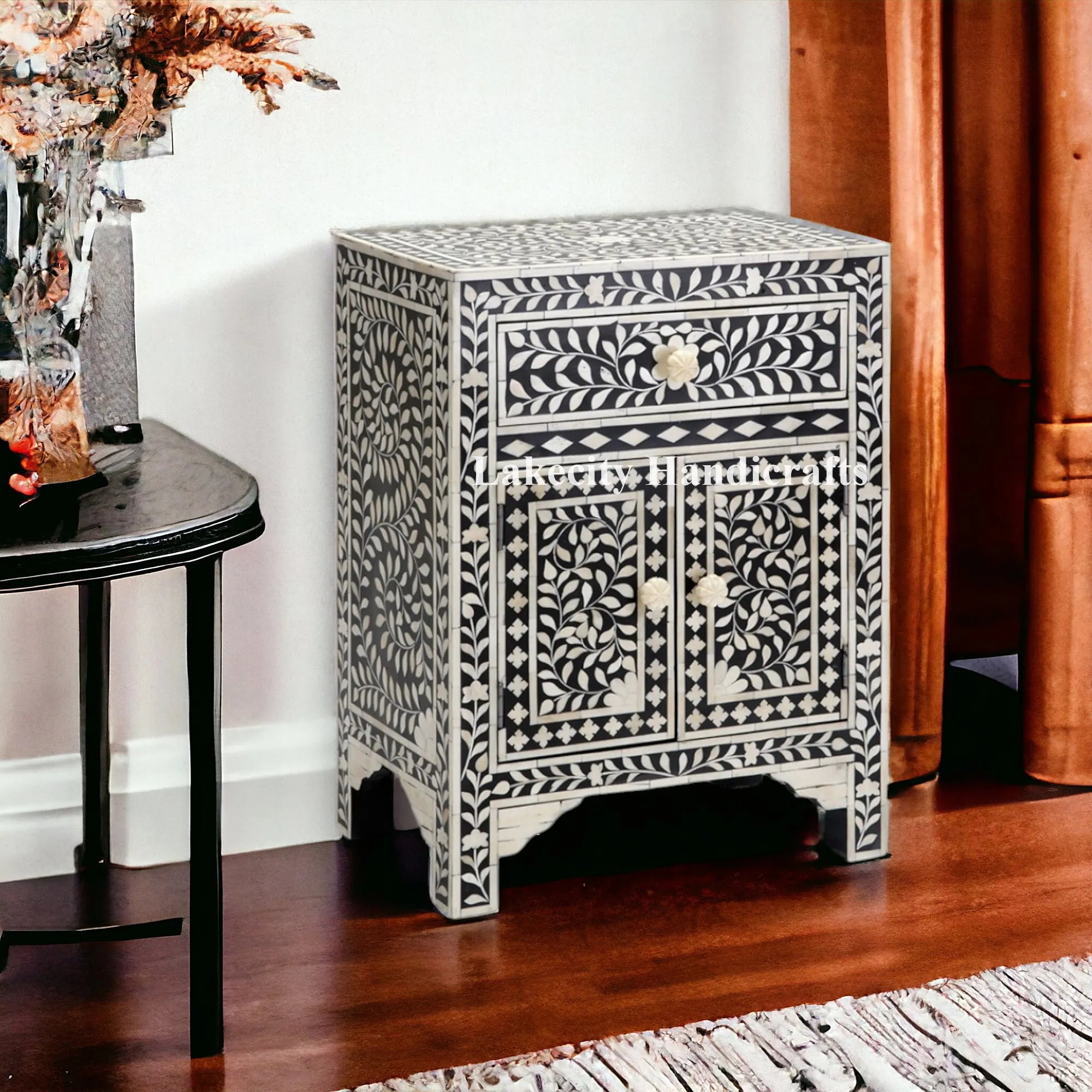 Perfectamente elaborada con el último diseño en Lakecity Handicrafts, nuestra mesita de noche con incrustaciones de hueso y diseño floral El diseño celebra el arte tradicional de incrustación ósea.