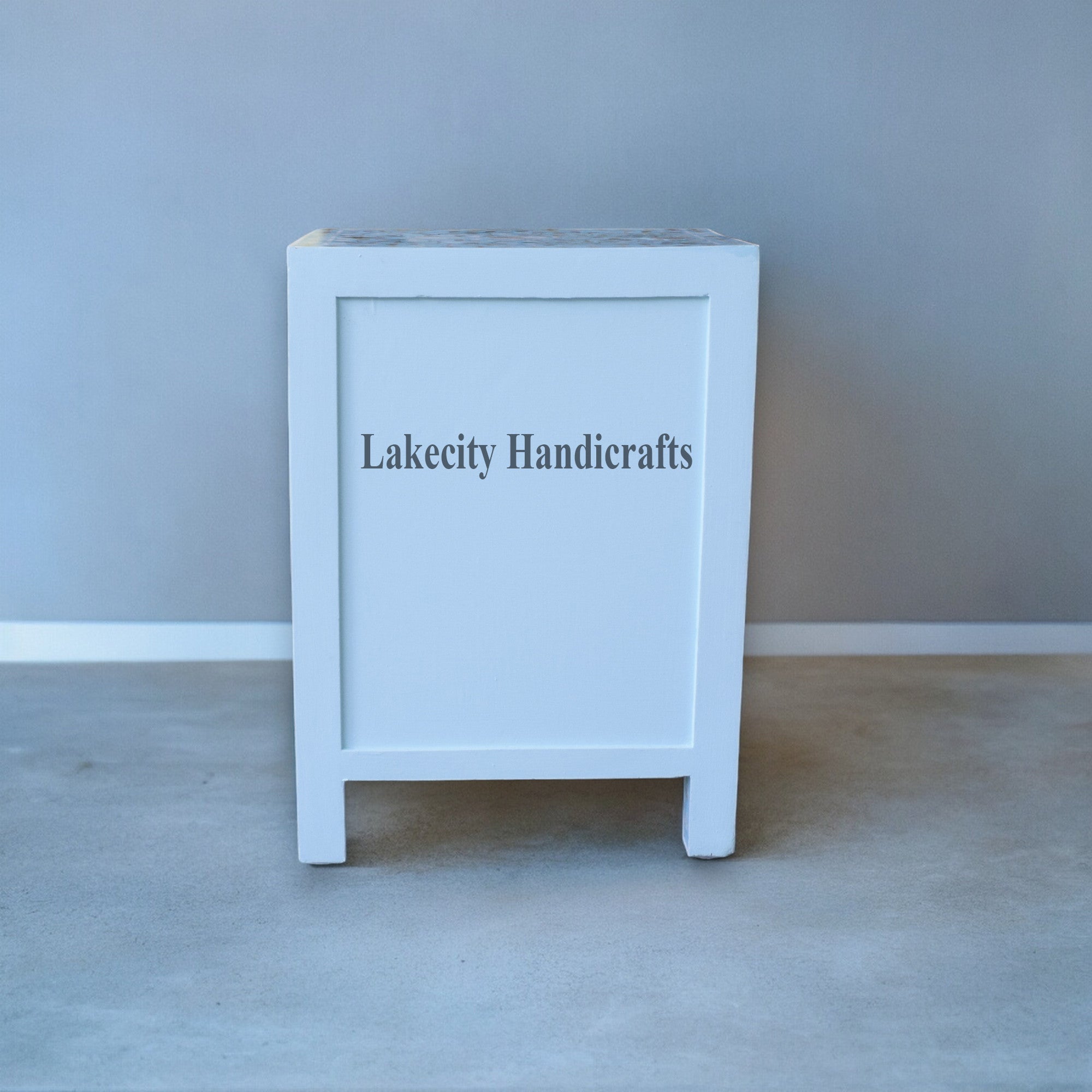 Elegante y lujosa, esta hermosa mesita de noche con incrustaciones de nácar de Luxury Handicrafts creará un ambiente chic y duradero en su dormitorio. La incrustación de nácar le da el toque distintivo de un mueble con incrustaciones, con el brillo y el resplandor de cientos de piezas de nácar.