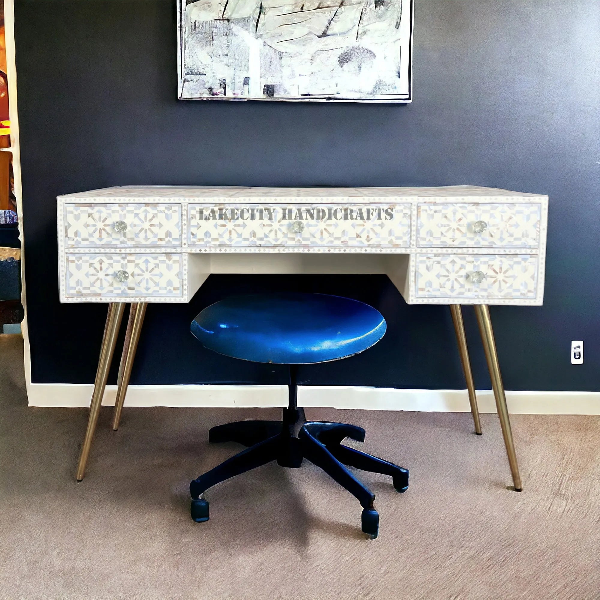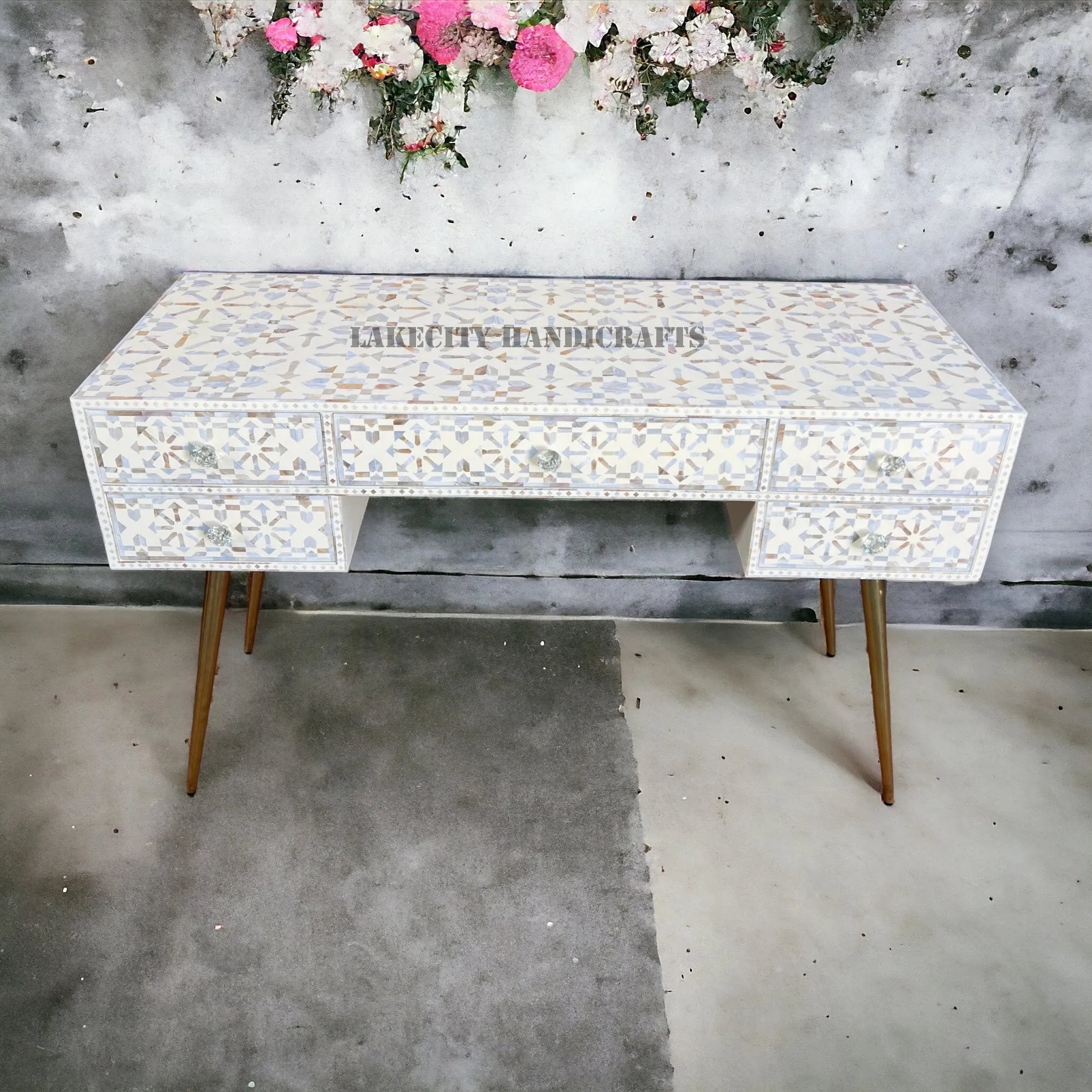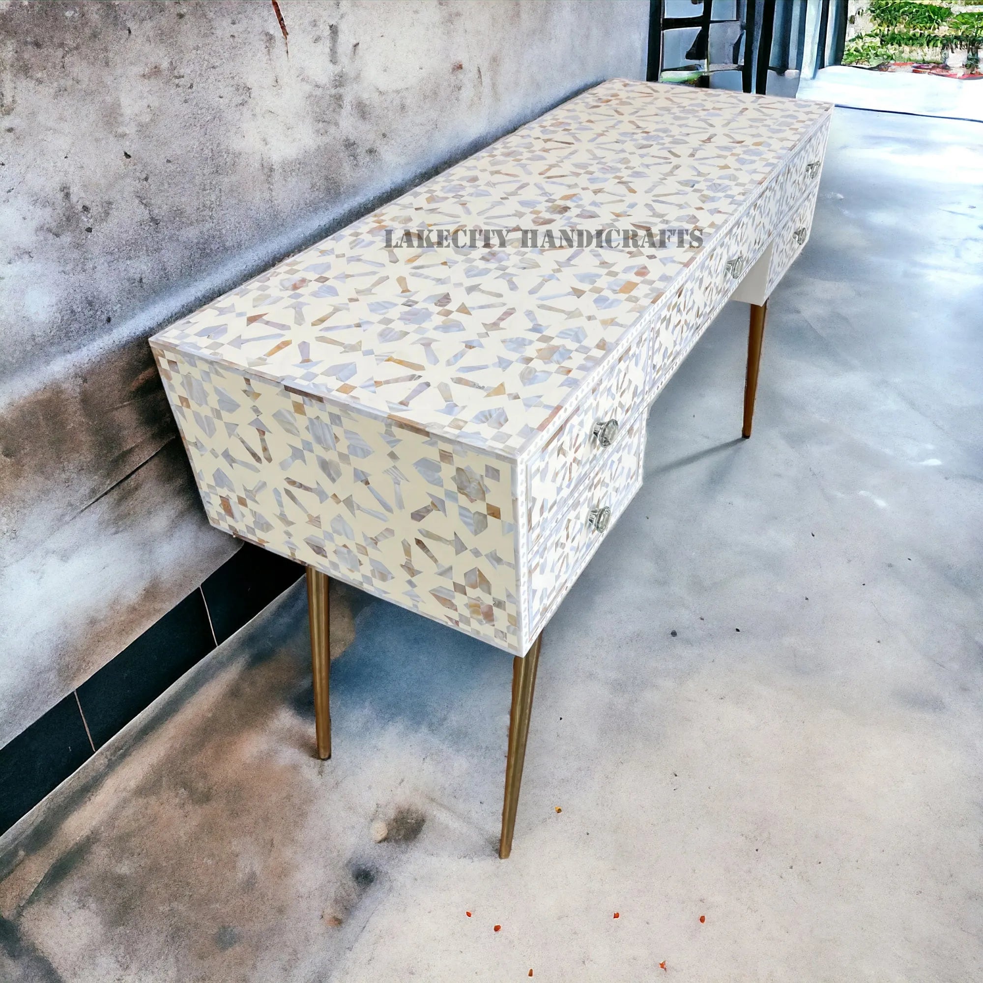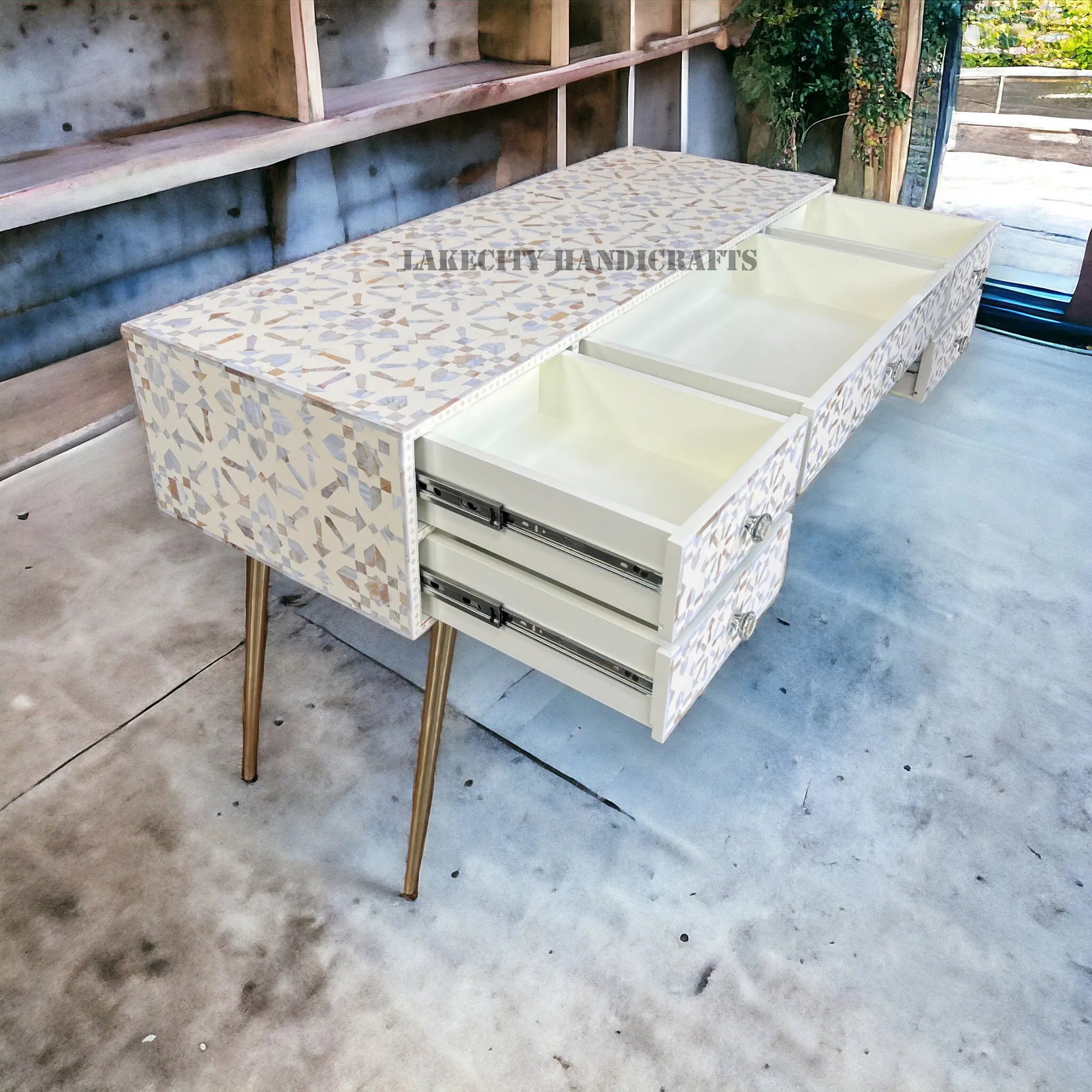 La artesanía de este escritorio con incrustaciones de nácar es inigualable. Cada pieza de nácar se corta y pule a mano, creando impresionantes patrones geométricos para crear un mueble que sin duda se convertirá en una reliquia.