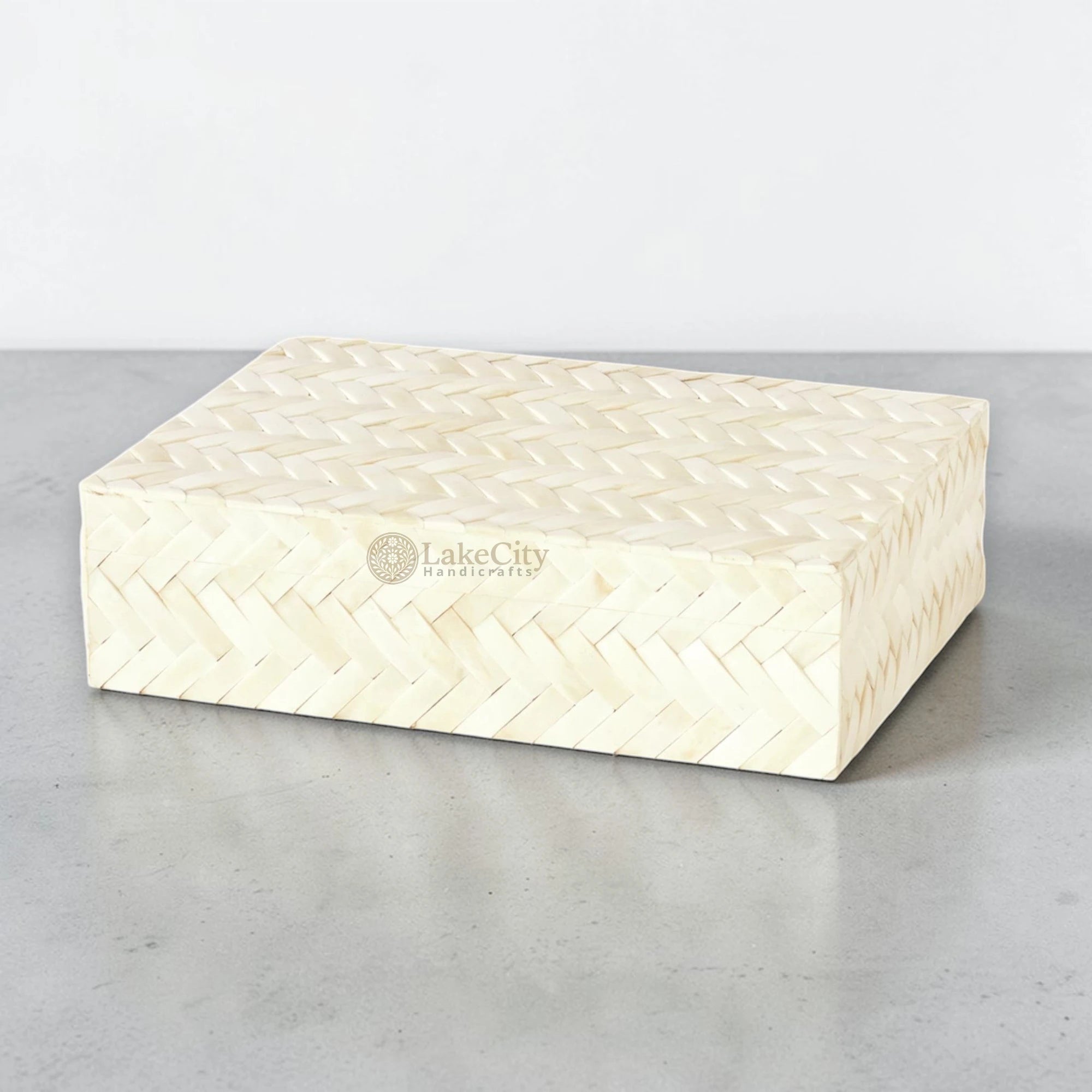 La petite boîte Anna Herring en incrustation d'os blanche est entièrement fabriquée à la main à partir d'os de buffle durable selon un motif à chevrons raffiné. Solide mais élégante, elle offre un style intemporel et un rangement pratique, ce qui en fait un bel accent qui dure des années.