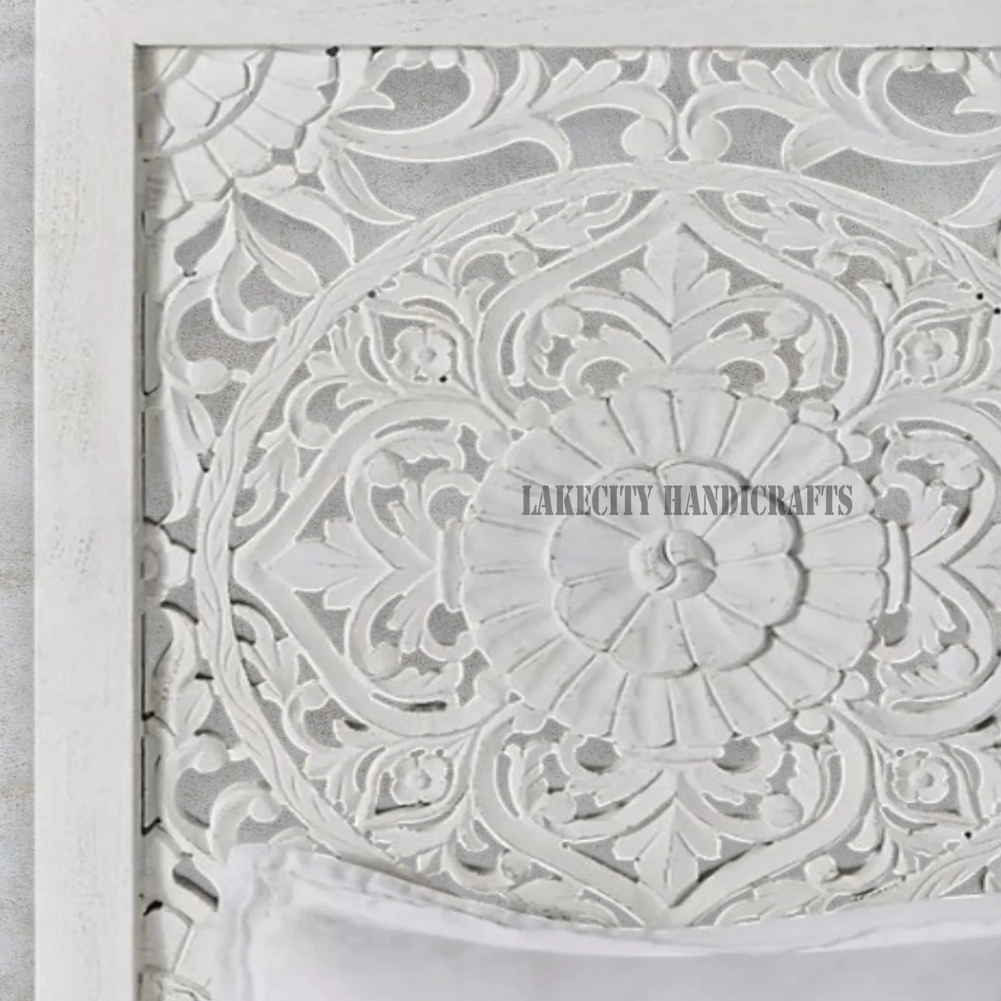 | Lit en bois exotique sculpté à la main avec une tête de lit à motif médaillon, finition naturelle, blanchie ou indigo |