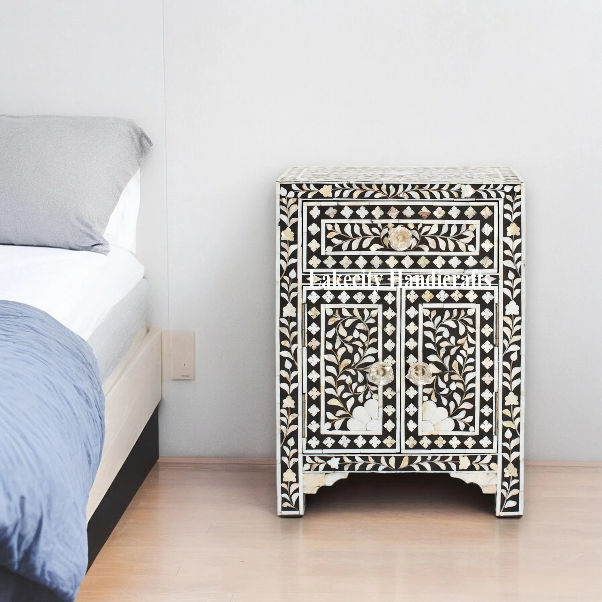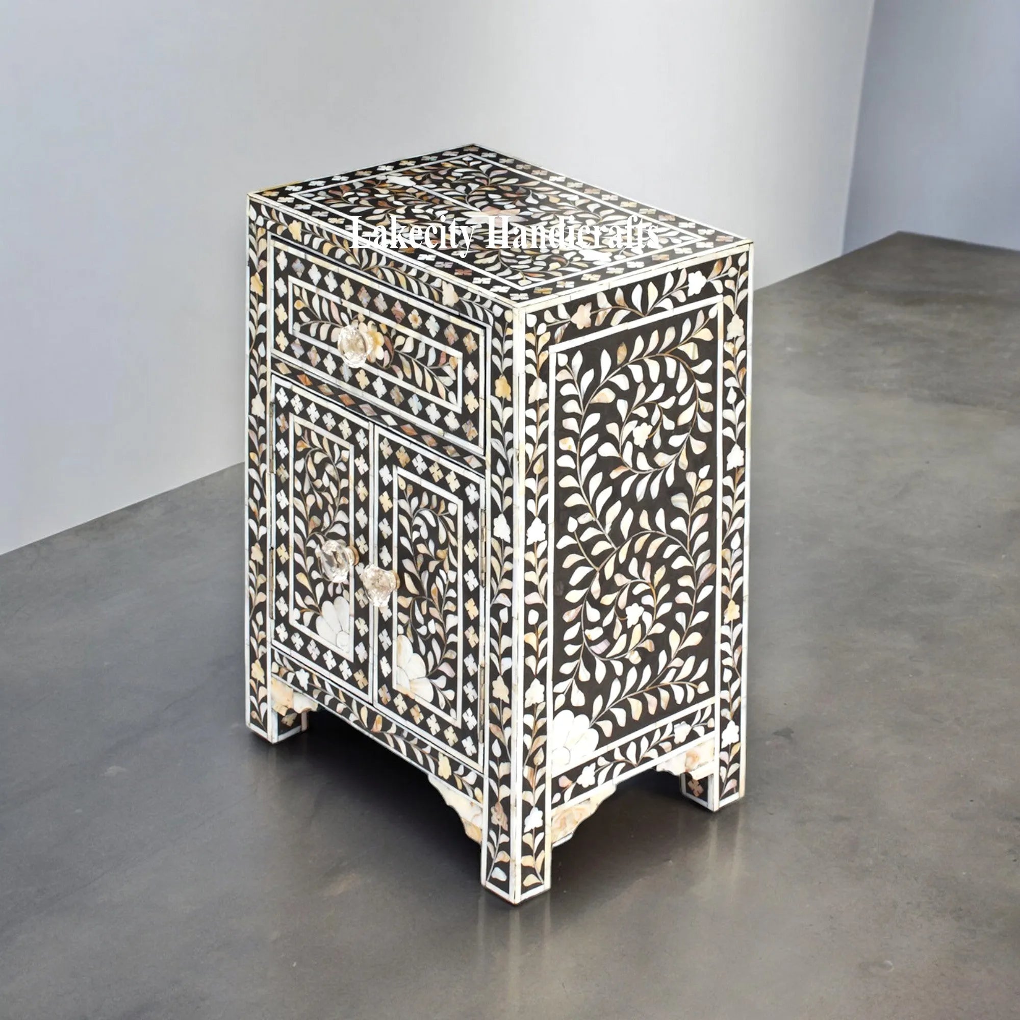 Table de chevet noire à motif floral en nacre, 1 tiroir et 2 portes
