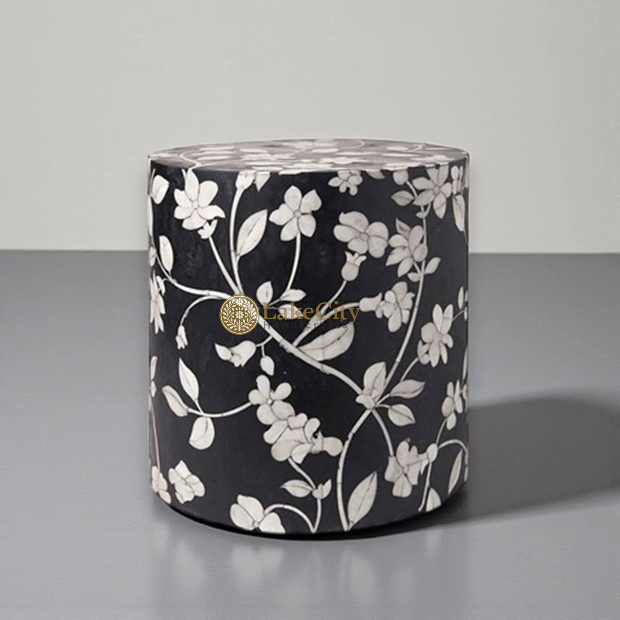 Each Bone Inlay stool has been laboriously handcrafted in India by skilled artisans. The traditional techniques are complemented by contemporary design, offering a unique focal point for your home. Made from bone inlay, black resin composite, and a solid wood frame. Due to the handcrafted nature of these products, no two will be identical, making each one truly unique.