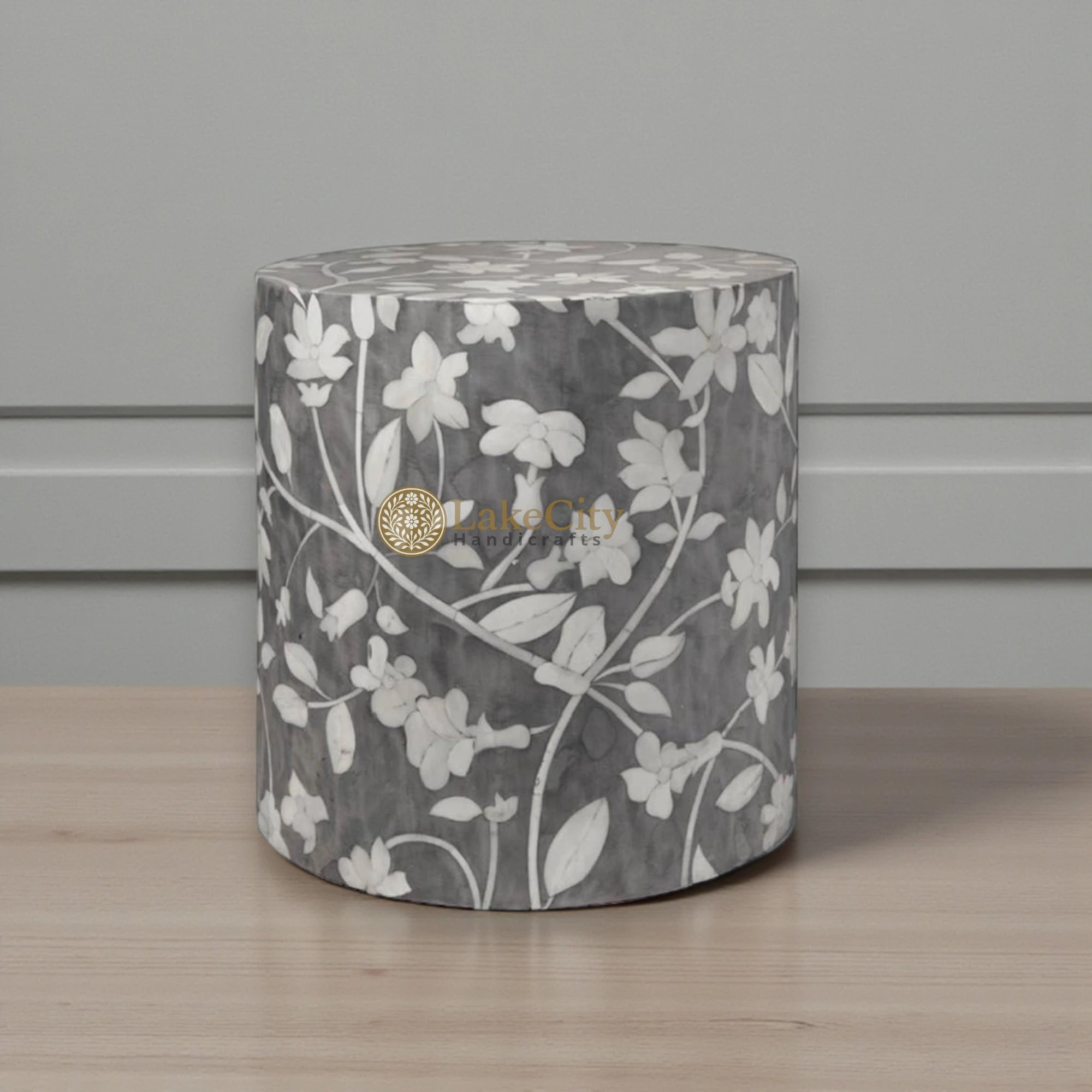 Each Bone Inlay stool has been laboriously handcrafted in India by skilled artisans. The traditional techniques are offset by the contemporary design and offer a unique focal point for your home. Made from bone inlay, Grey resin composite, and a solid wood frame. Due to the handcrafted nature of these products, no two will be the same, making each one unique.