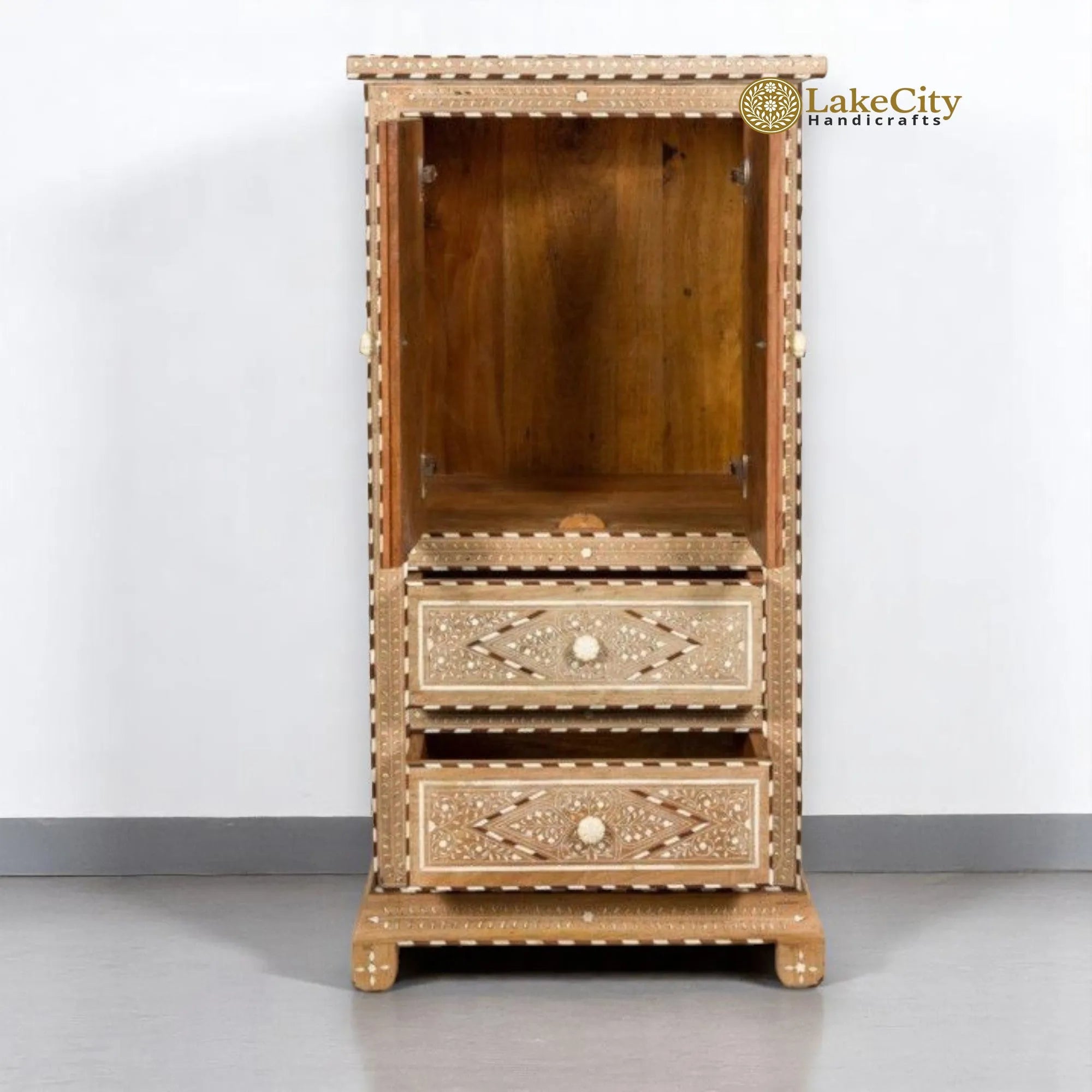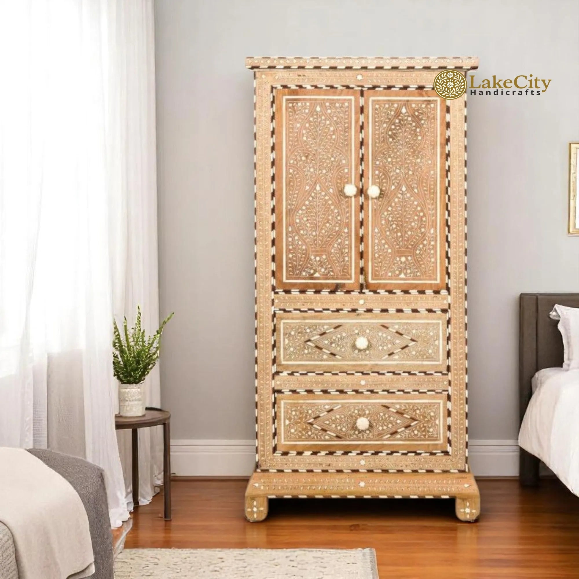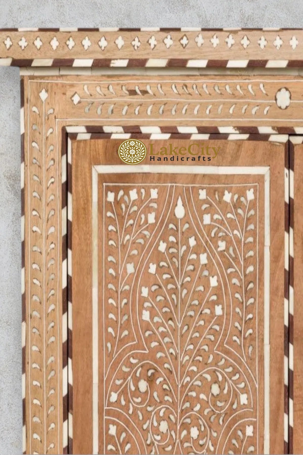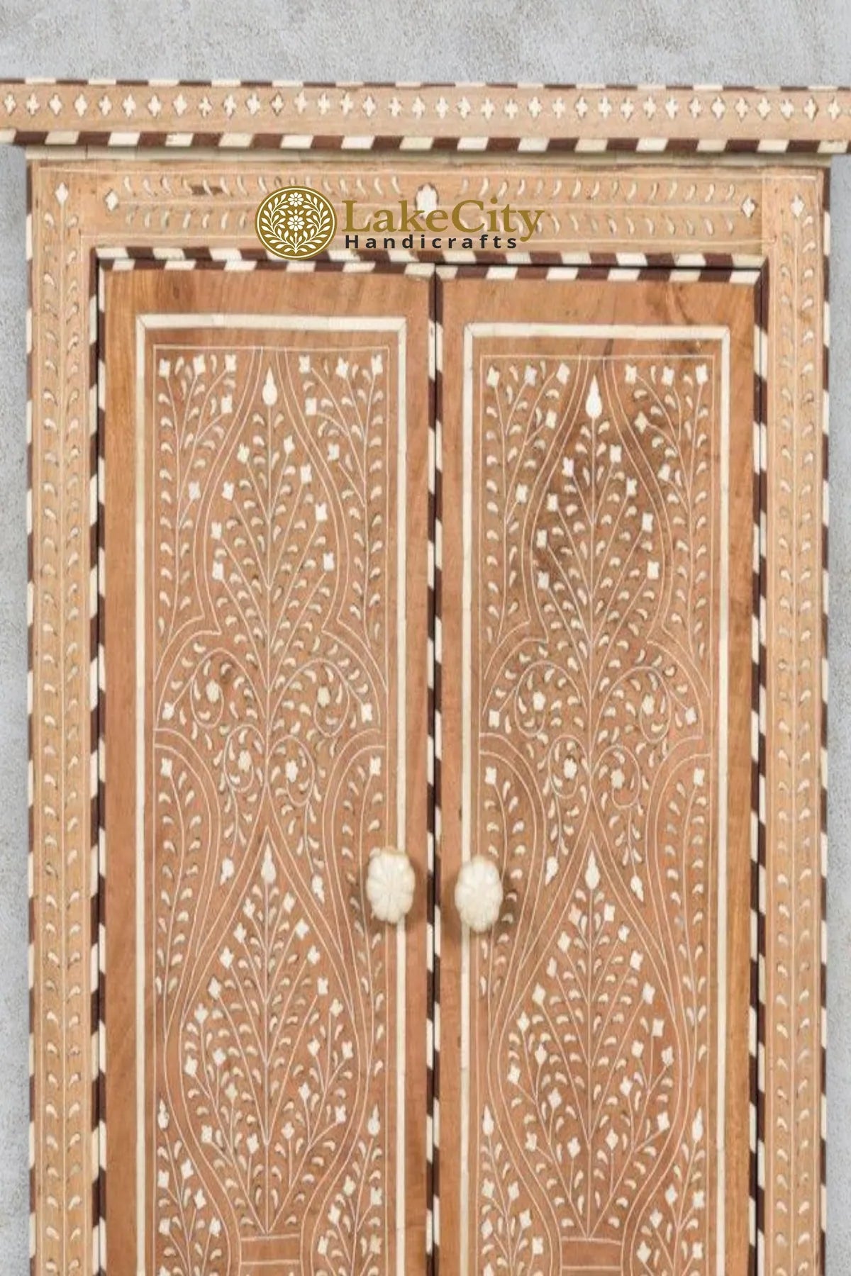 This wardrobe is made of teak wood, which is known for its durability and natural beauty. It has intricate bone inlays, giving it a unique and elegant look. With its vintage Anglo-Indian design, this wardrobe adds a touch of history and style to any room. It's not just a practical storage solution but also a beautiful piece of furniture that can enhance the aesthetic appeal of your space.