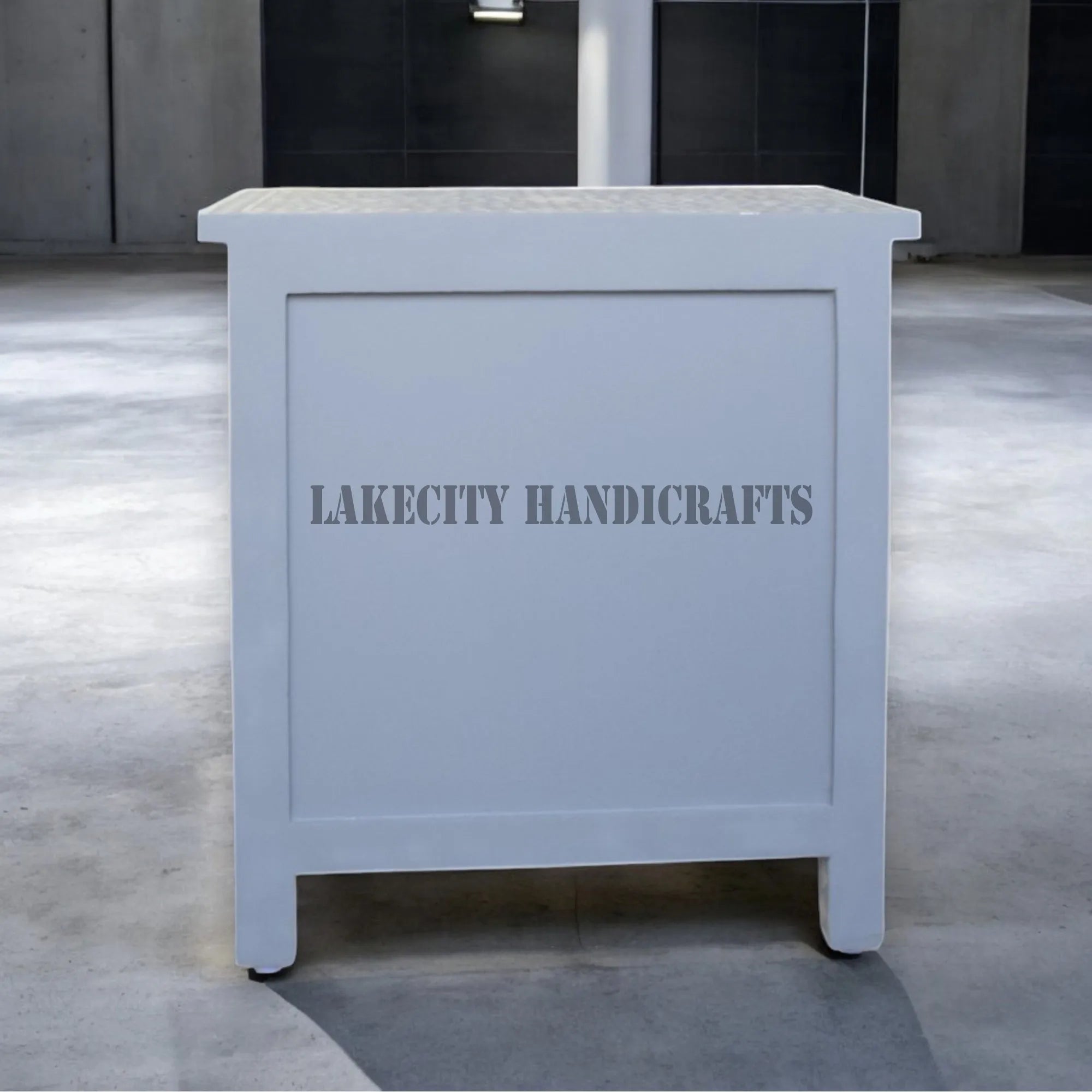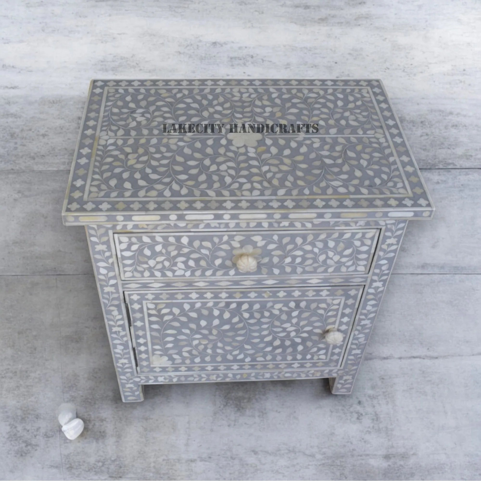 This timeless bedside table by Lakecity Handicrafts will transform any bedroom, with intricate detailing in a luxurious and modern floral design. The bedside table is spacious with room for a lamp, and would also look stunning with hanging pendant lights above, to really showoff the handmade bone inlay detailing. Finished with gorgeous carved handles.