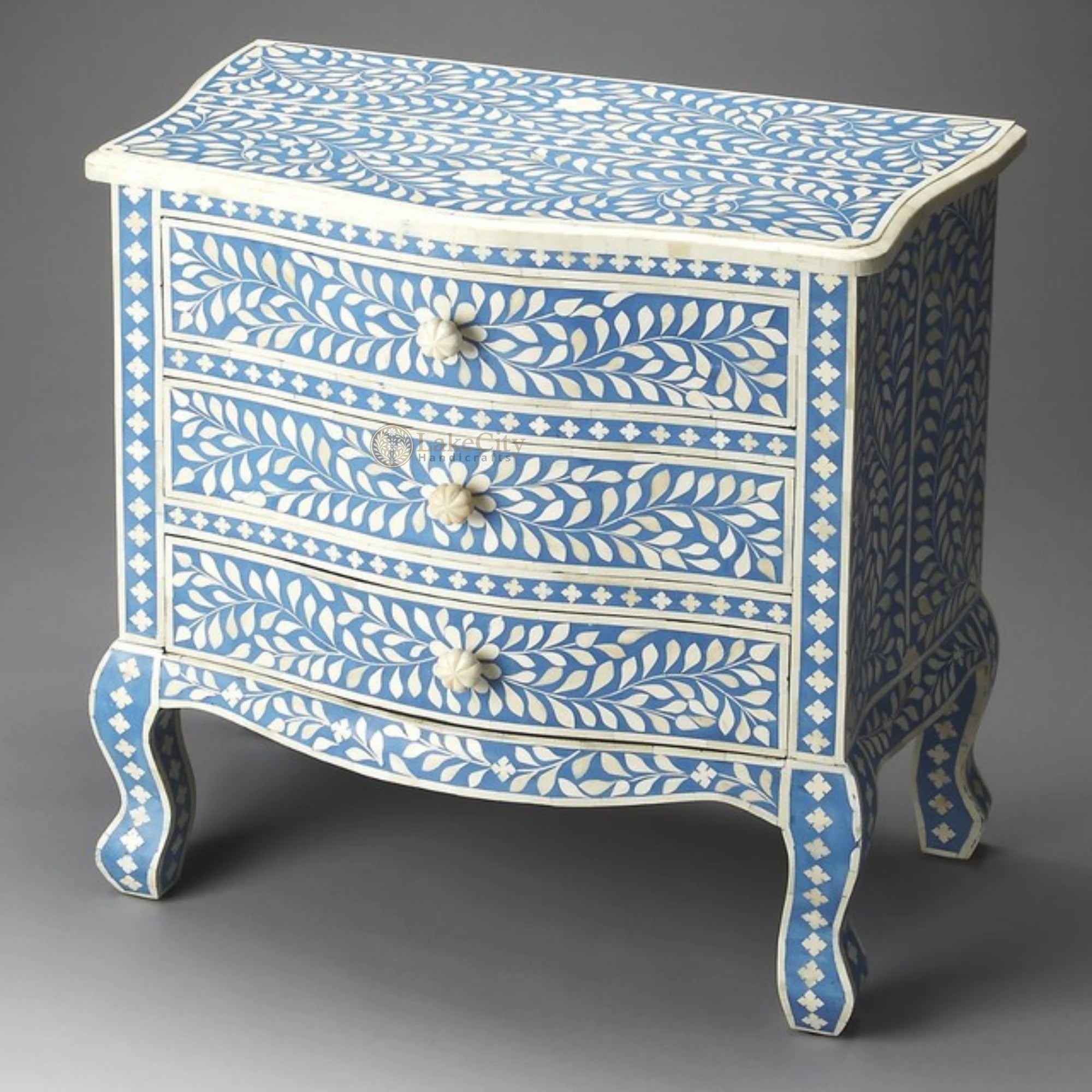 Bone Inlay Floral Design Accent Chest Three Drawers Curved Leg Light Blue