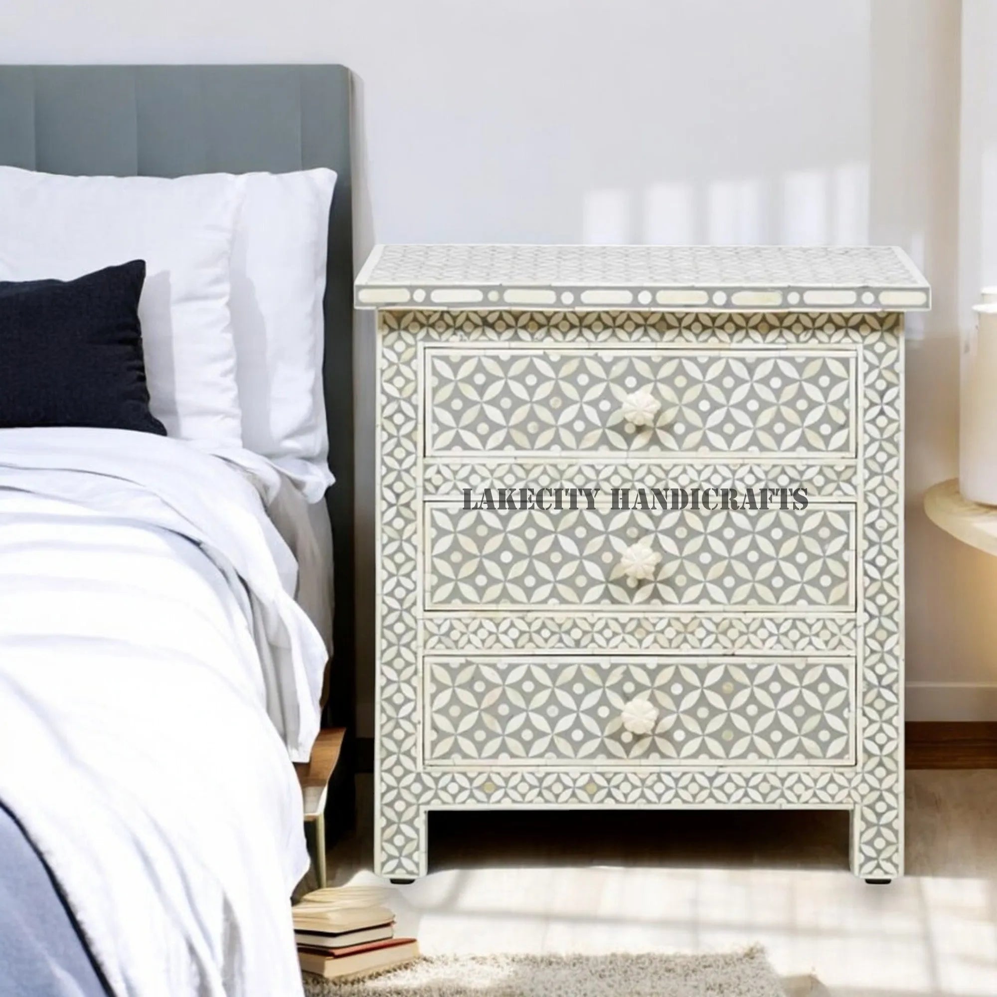 Our bone inlay Bedside will complement existing bedroom furnishings and add that unique character to your peaceful space! Consisting of 3 drawers for ample bedside storage, it is lovingly created with the use of camel bone and resin to cleverly design whichever exquisite pattern for you.
