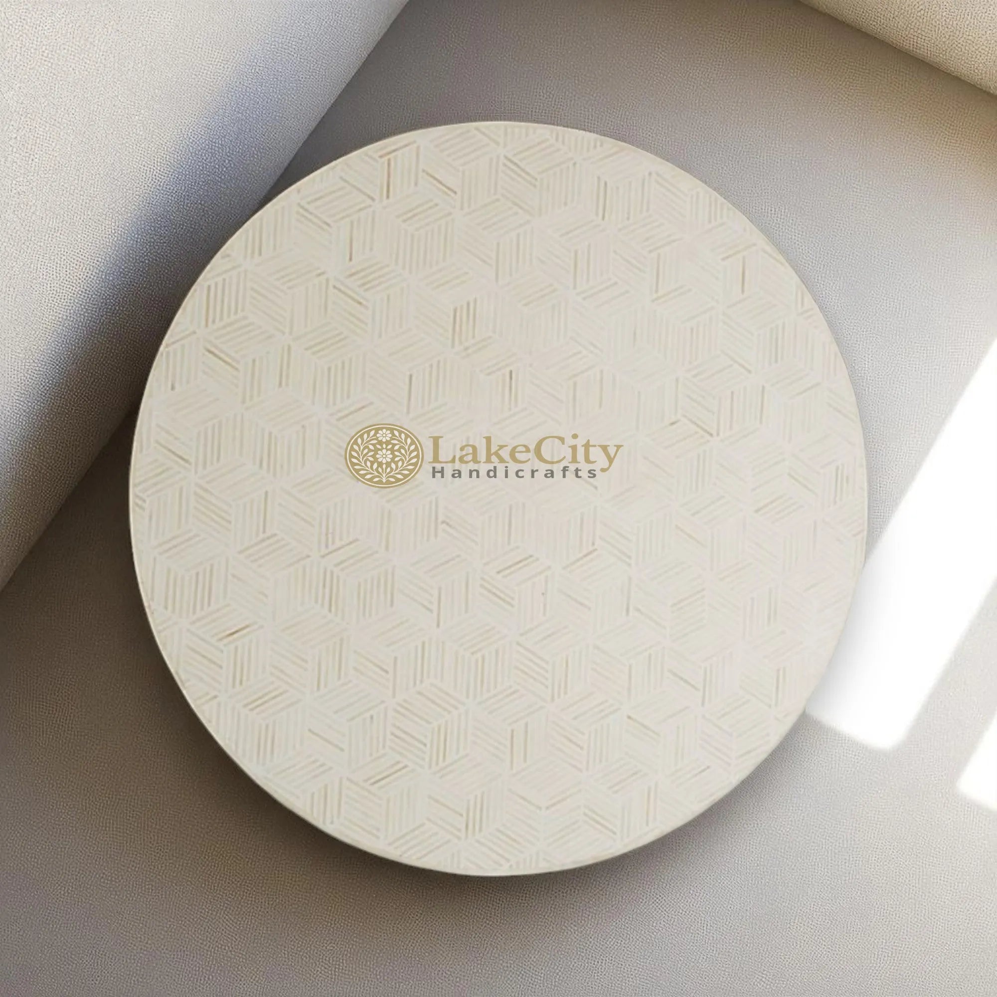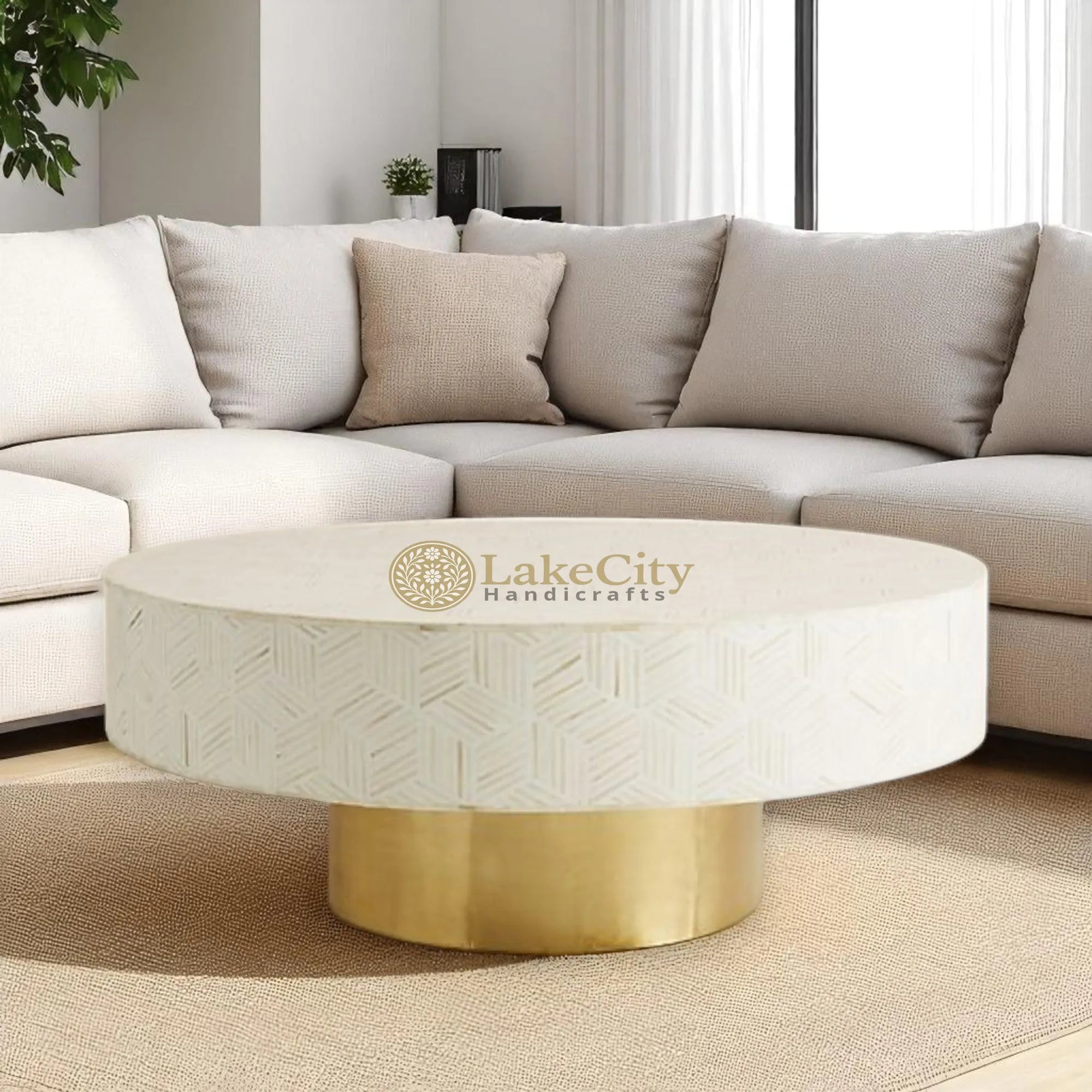 Since the days of ancient Egypt, craftsmen have been using inlaid bone to decorate furniture surfaces, and for good reason: it embodies a natural sheen that adds instant luxury to any space. Handcrafted using the same centuries-old technique at Lakecity Handicrafts, this room-anchoring piece captures the essence of inlay work with a reiterative bone inlay design atop a cylindrical brass base.