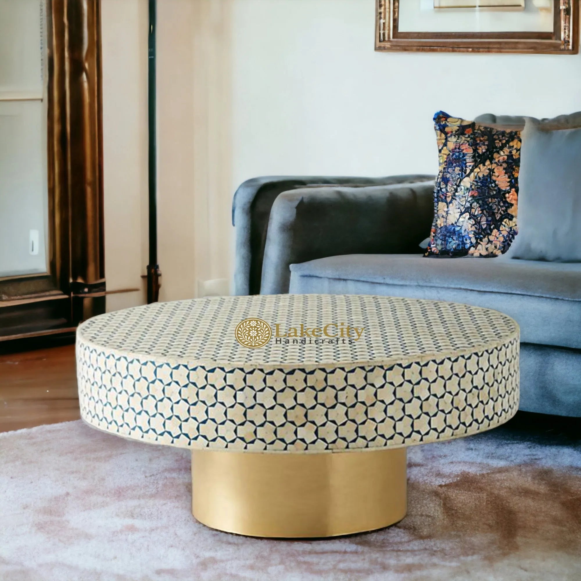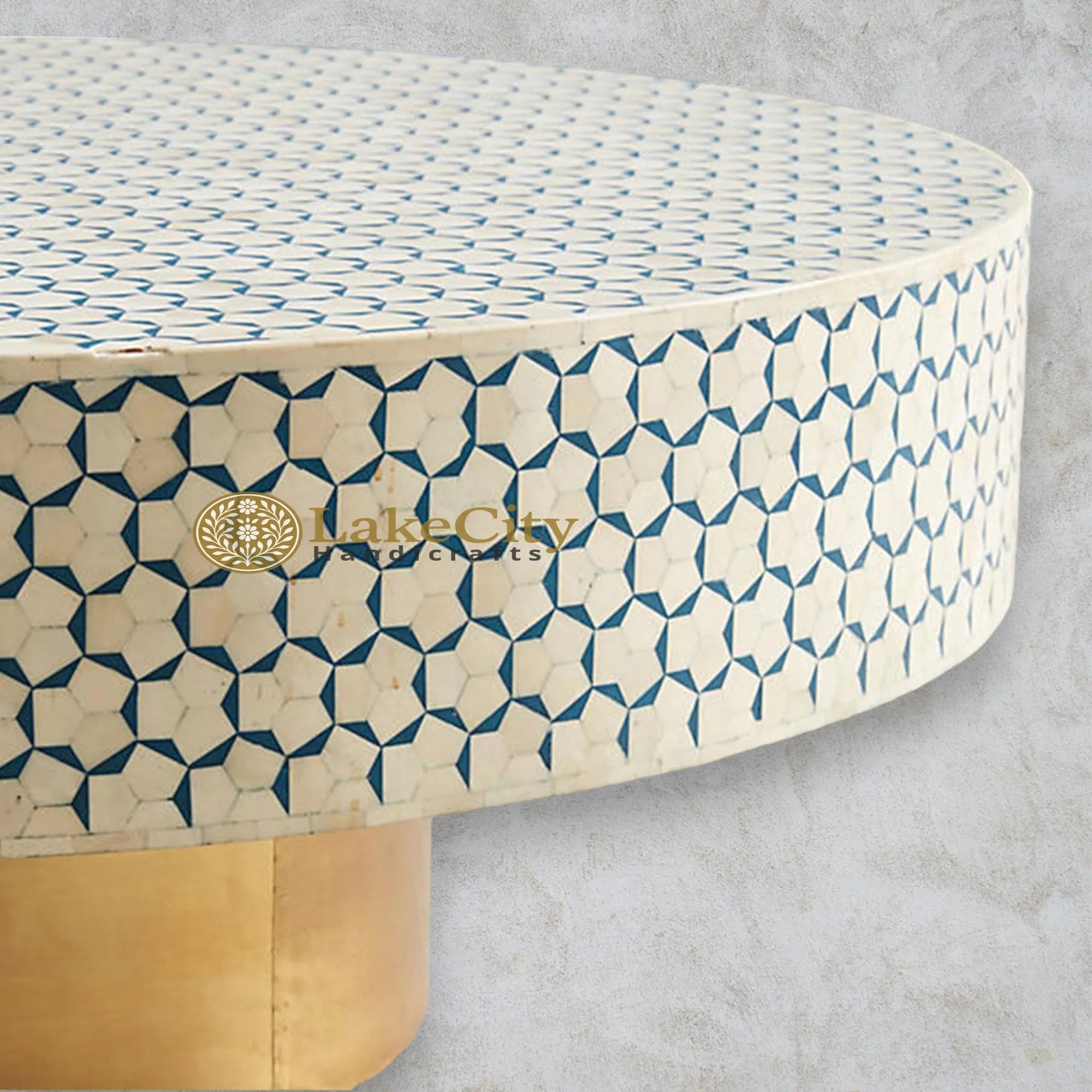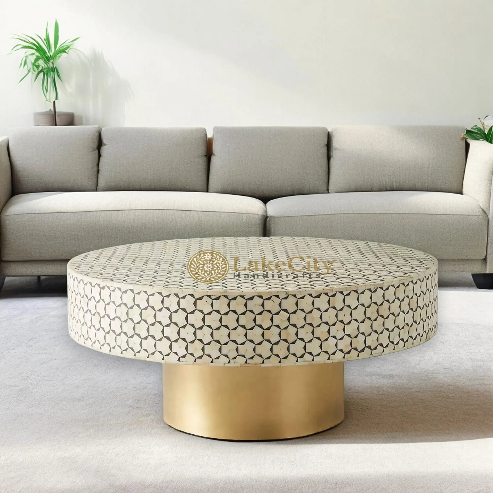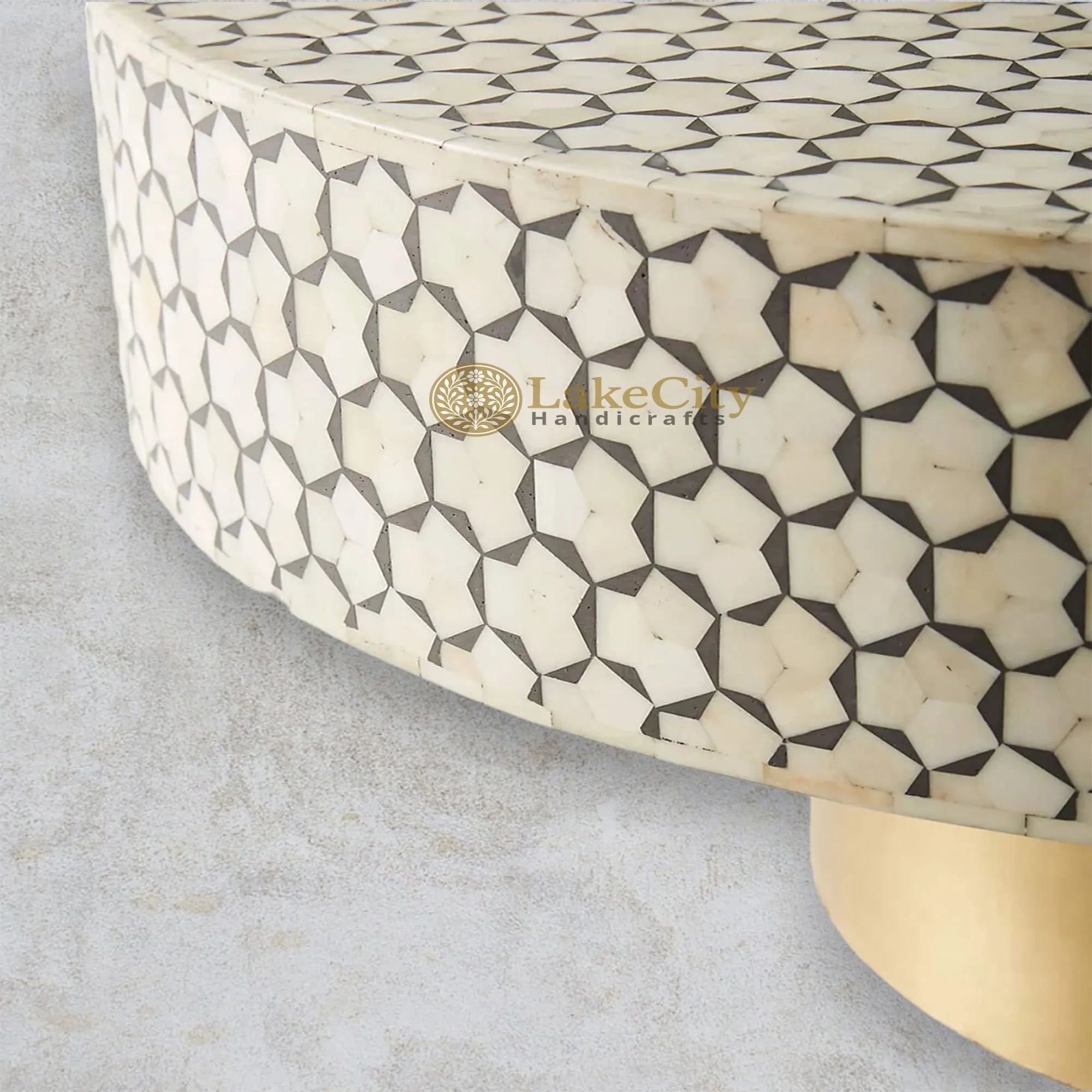 Since the days of ancient Egypt, craftsmen have been using inlaid bone to decorate furniture surfaces, and for good reason: it embodies a natural sheen that adds instant luxury to any space. Handcrafted using the same centuries-old technique at Lakecity Handicrafts, this room-anchoring piece captures the essence of inlay work with a reiterative bone inlay design atop a cylindrical brass base.