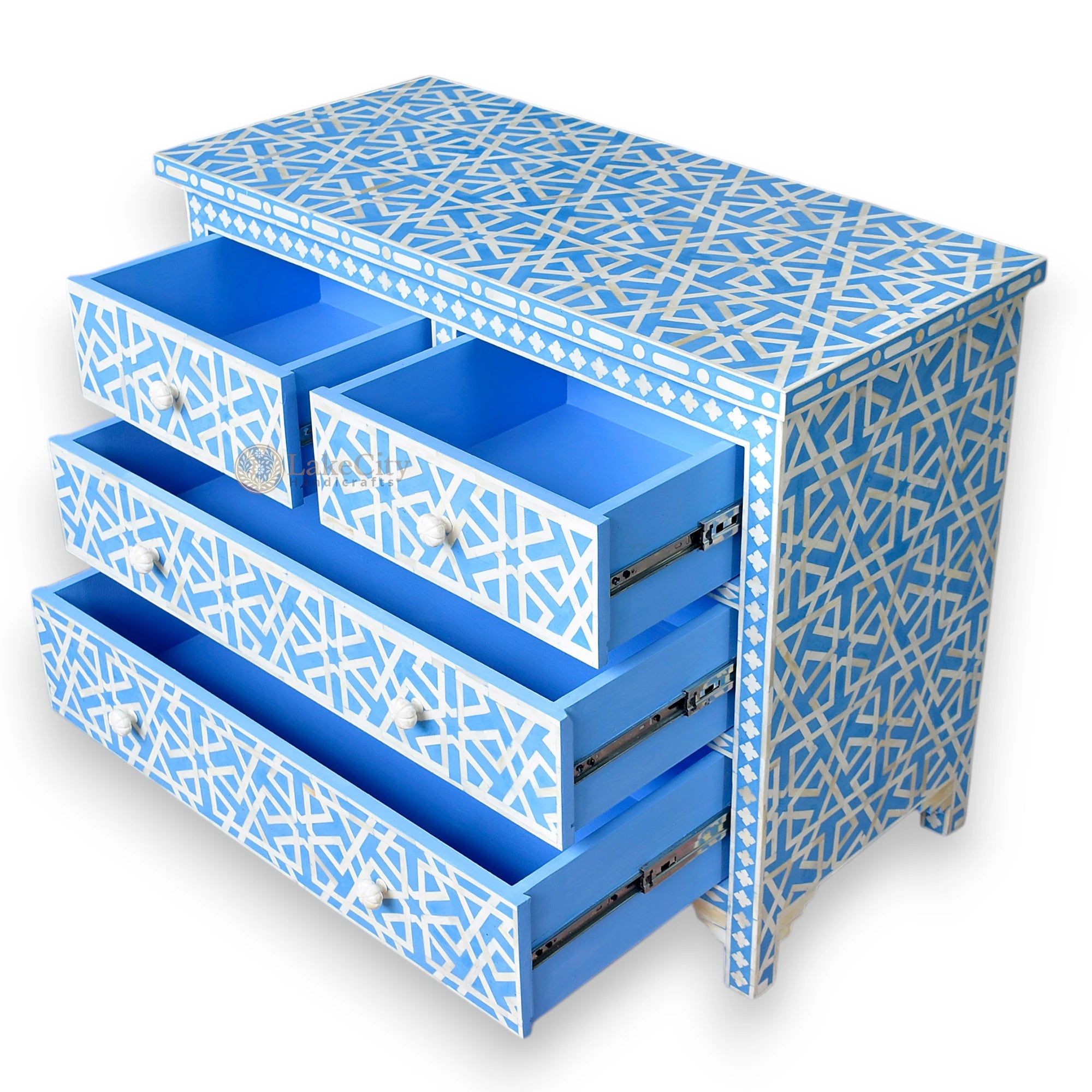 Crafted with charm and unique character, our wooden chest of drawers features a contemporary star pattern by Designers from Lakecity Handicrafts. It is made up of camel bone and dyed resin with two small drawers at the top and 2 larger drawers, giving ample storage for either living areas or the bedroom. Bone knobs finish off this exquisite piece of art.
