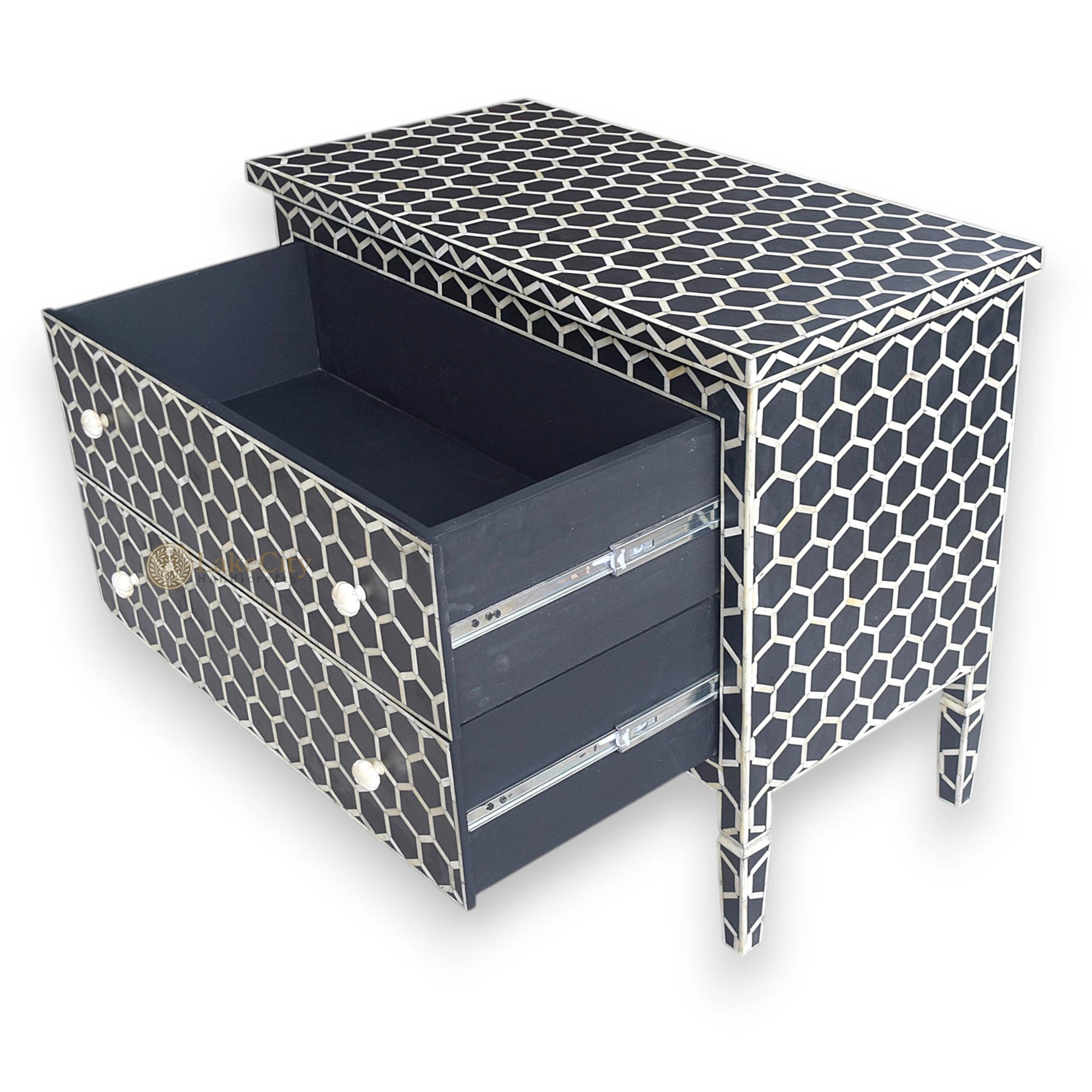 Beautiful in a foyer or long hallway, our handcrafted, inlaid Honeycomb Chest provides storage and a sophisticated touch to an area that “just needs something.” Handcrafted bone and resin tiles inlaid on a wood base. Honeycomb design—black interior.
