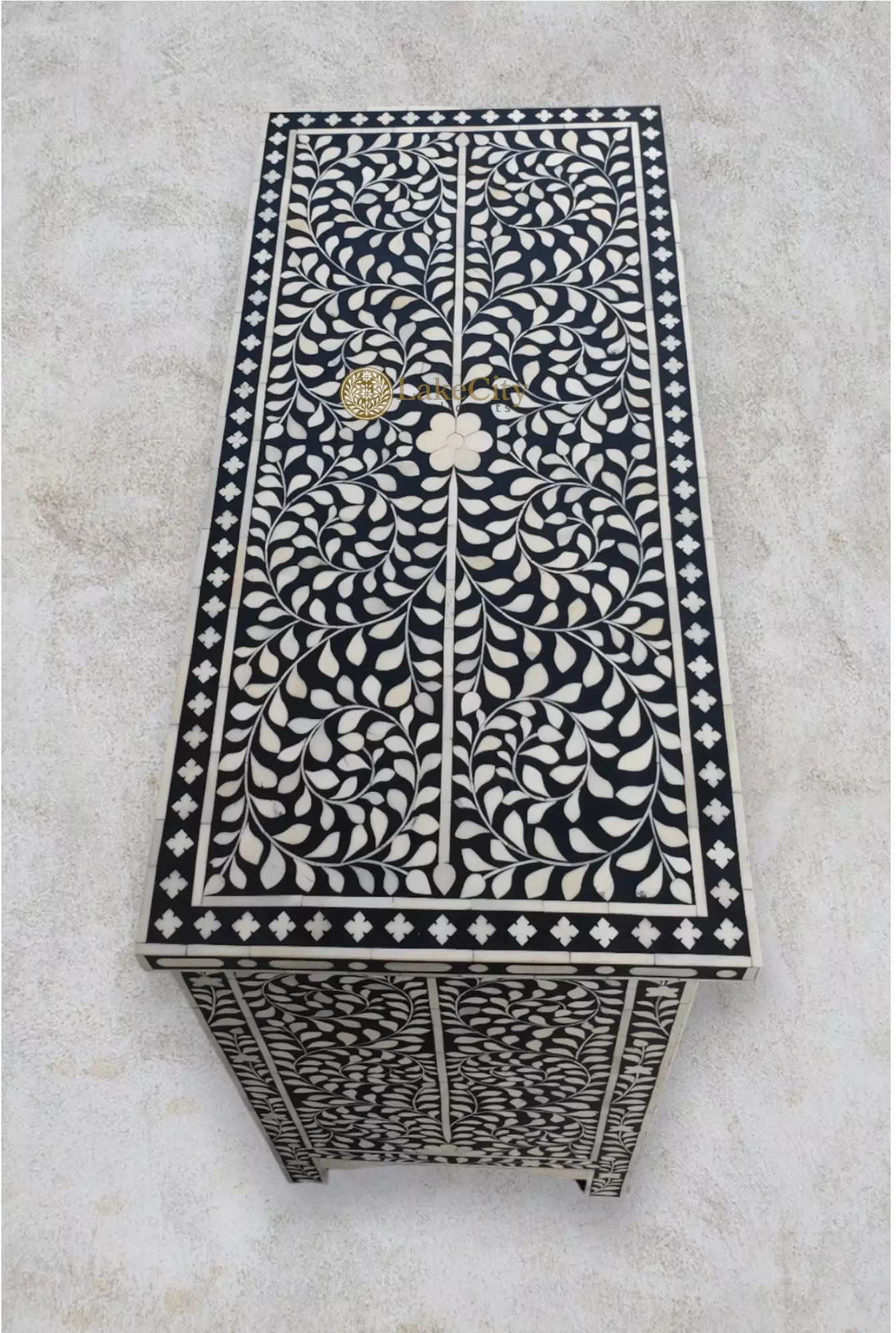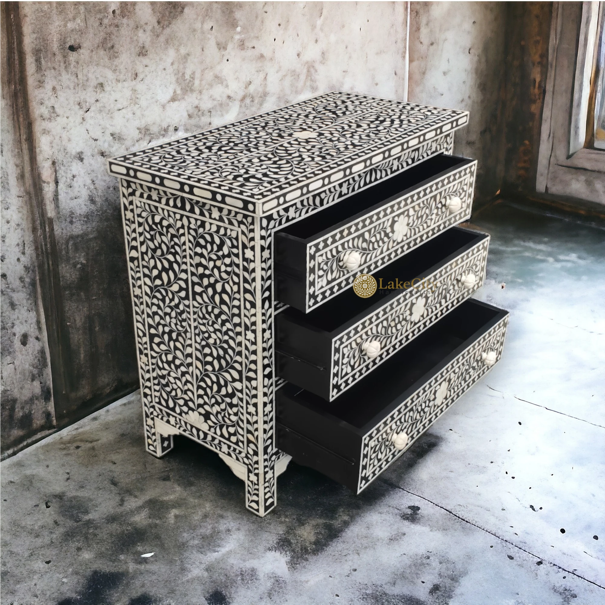 Handcrafted to perfection, this bone-inlaid medium-sized chest of 3 drawer is perfect luxury. Fit it in any space in the house and make the space look luxurious.