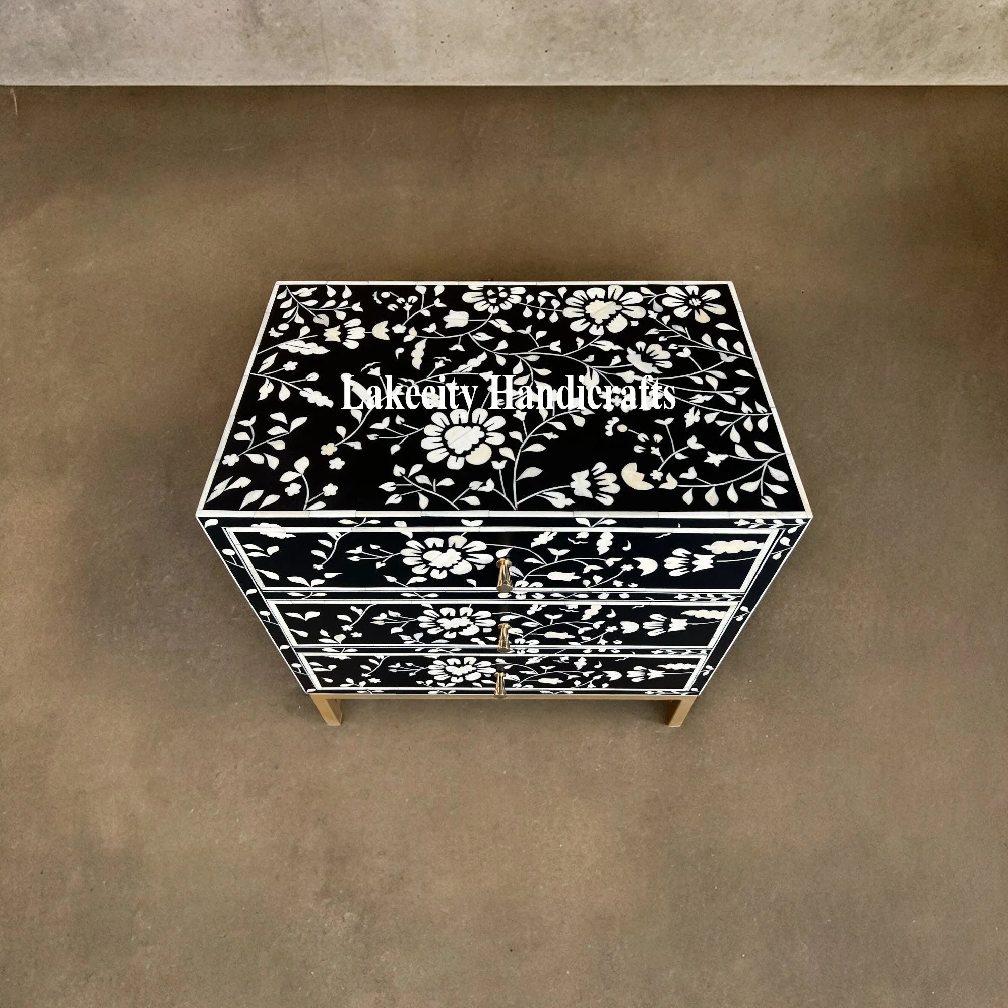 Bone Inlay Flowers Design Blooming Bedside Black | Floral Bone Inlay Nightstand Table