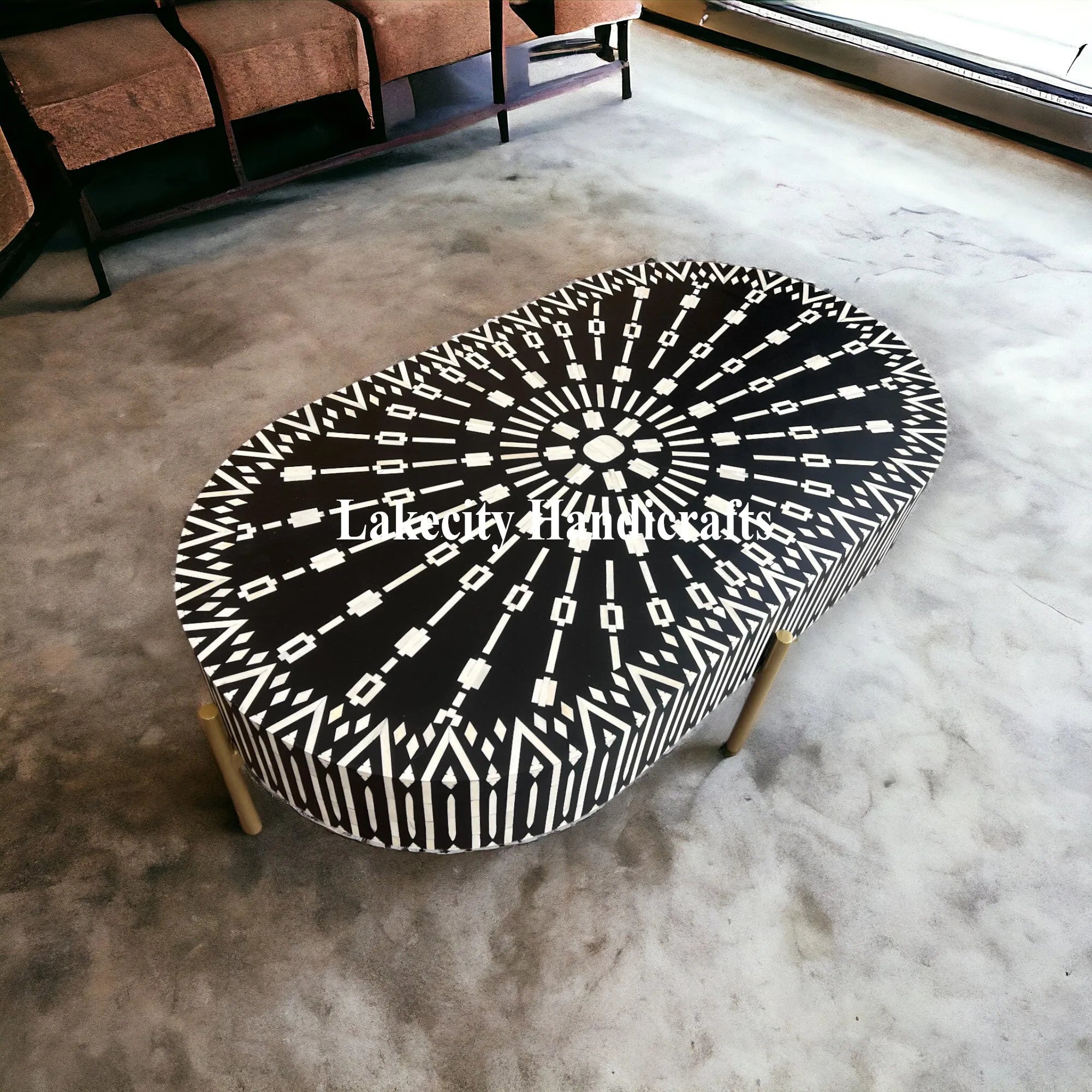 Bone Inlay Kalmin Oval Shape Coffee Table Black | Bone Inlay Kalmin Oval Shape Center Table Black