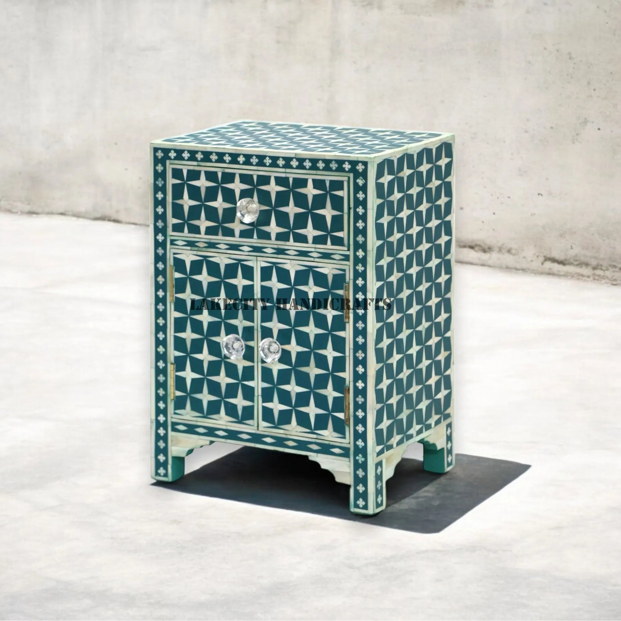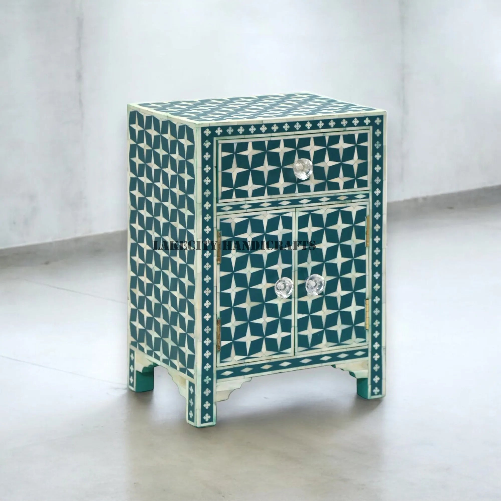 Crafted with charm and unique character, our small One drawer Two Door Bone Inlaid wooden bedside table features a classic Star pattern exclusive to Lakecity Handicrafts, made up of camel bone and Green resin.