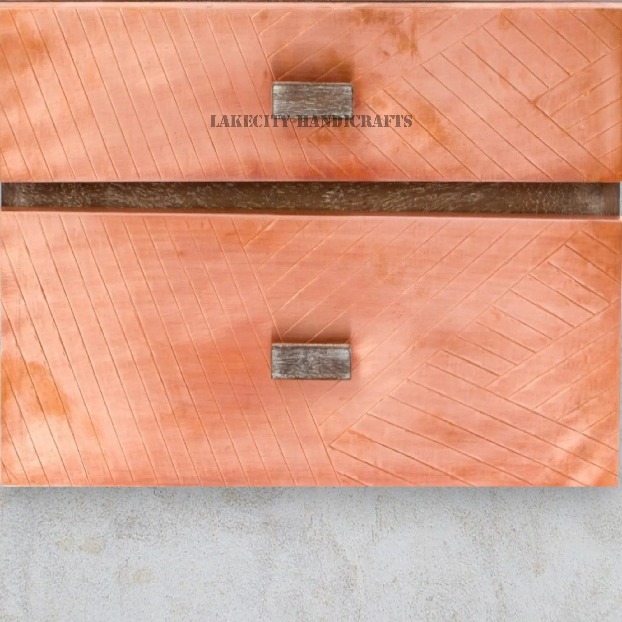 Update your bedroom effortlessly with this Bedside / side table / nightstand. It is crafted with an on trend metallic copper front. There is lots of storage space in the Two Drawers to keep your bedroom free of clutter. This furniture is built from plantation mango wood, a commonly used timber in India. The copper front should not tarnish beyond a slight antique look, which many people find attractive.