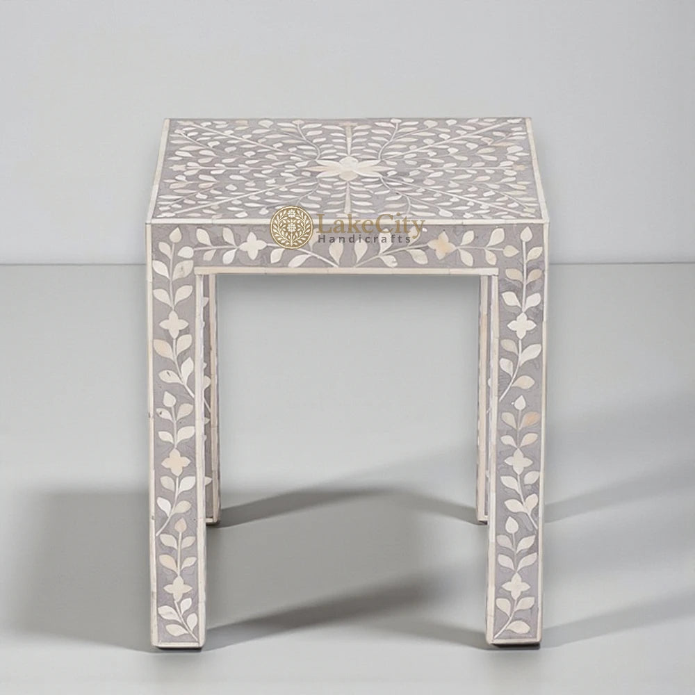 Each Bone Inlay side table has been laboriously handcrafted in India by skilled artisans. The traditional techniques are offset by the contemporary design and offer a unique focal point for your home. Made from bone inlay, resin composite, and a solid wood frame. Due to the handcrafted nature of these products, no two will be the same, making each one unique.