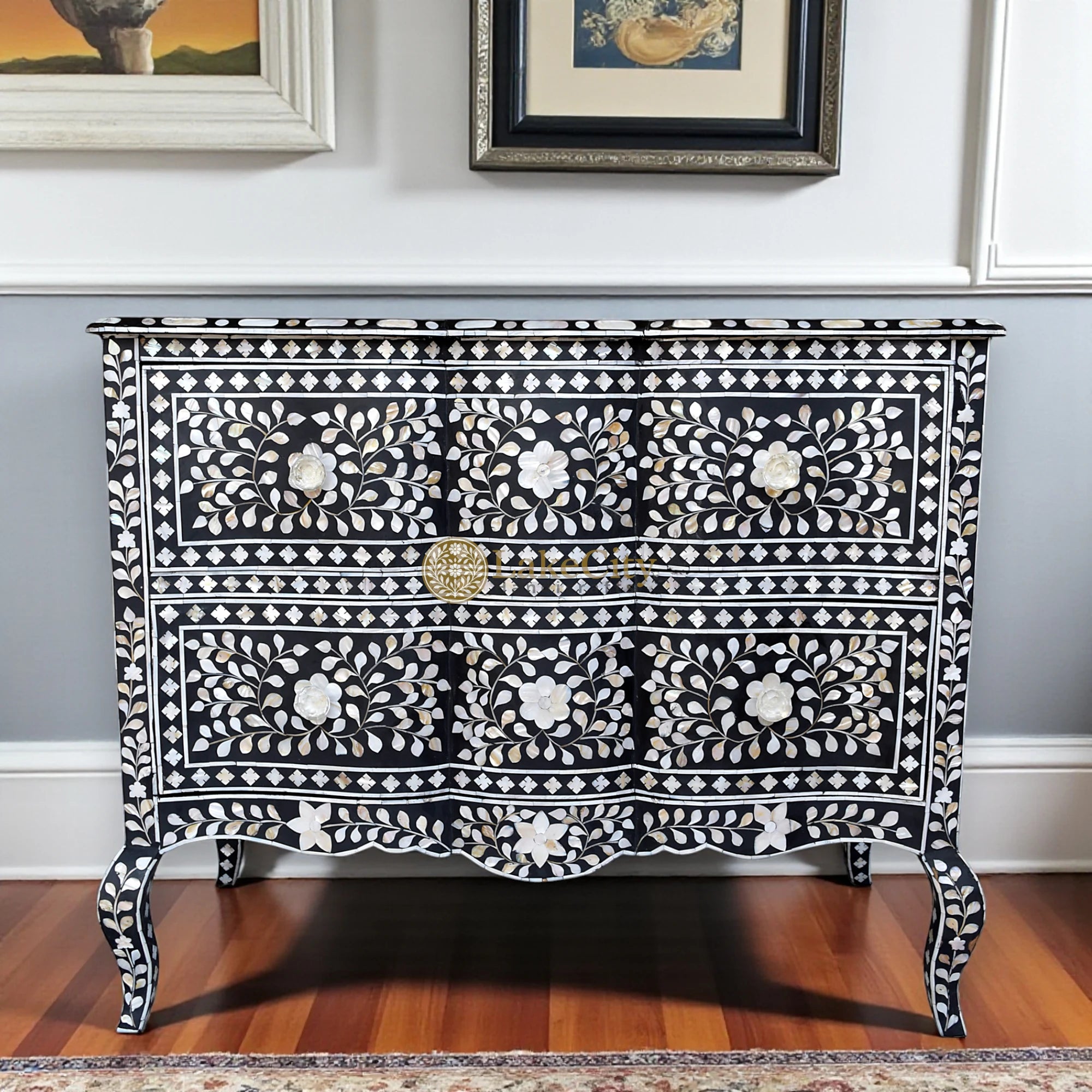 Handcrafted by specialized artisans at Lakecity Handicrafts in India the French-style bone inlay chest of drawers would make a beautiful investment piece. Each piece takes 3 weeks to make and they are inlaid with reliably sourced Mother of Pearl.