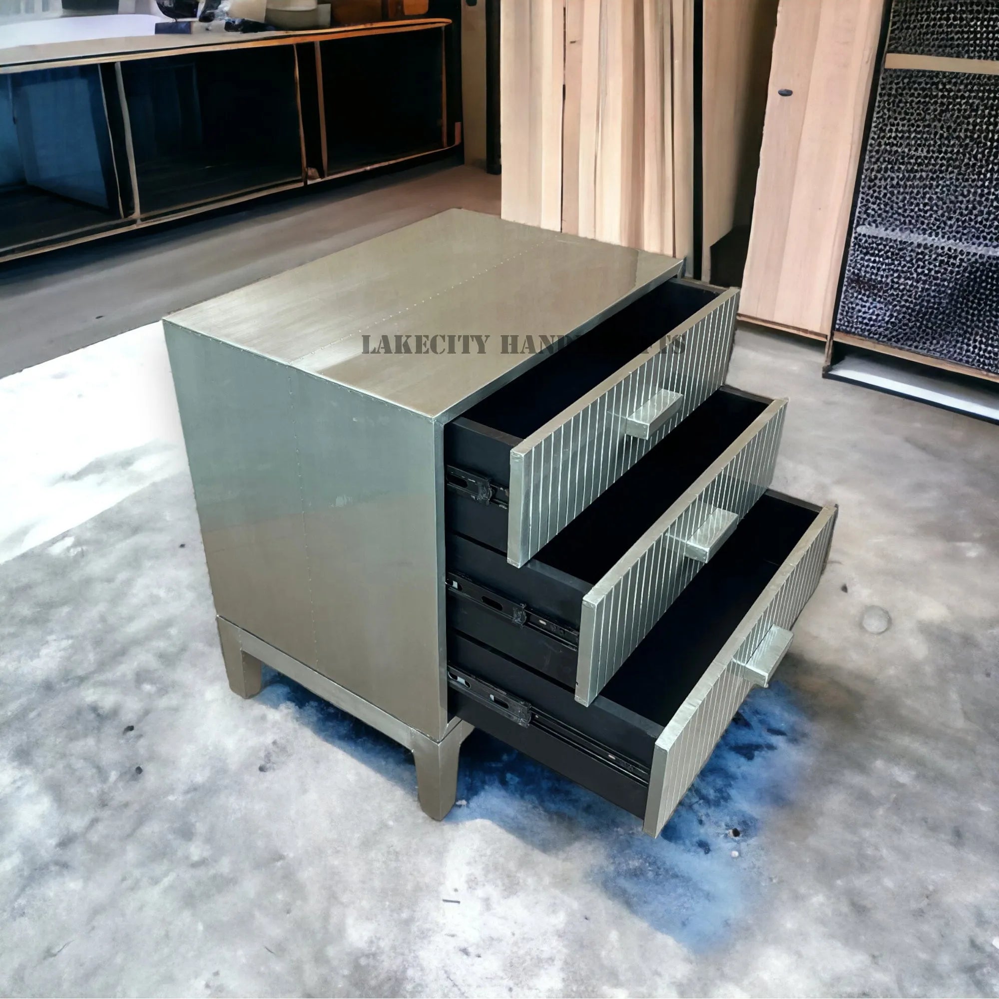 This beautifully hand stamped silver metal bedside with drawers by Lakecity Handicrafts blends both art and refinement. Silver white metal is meticulously embossed to a wooden frame. Other furniture available in this range. This product is handcrafted from natural materials and therefore slight variations may occur.