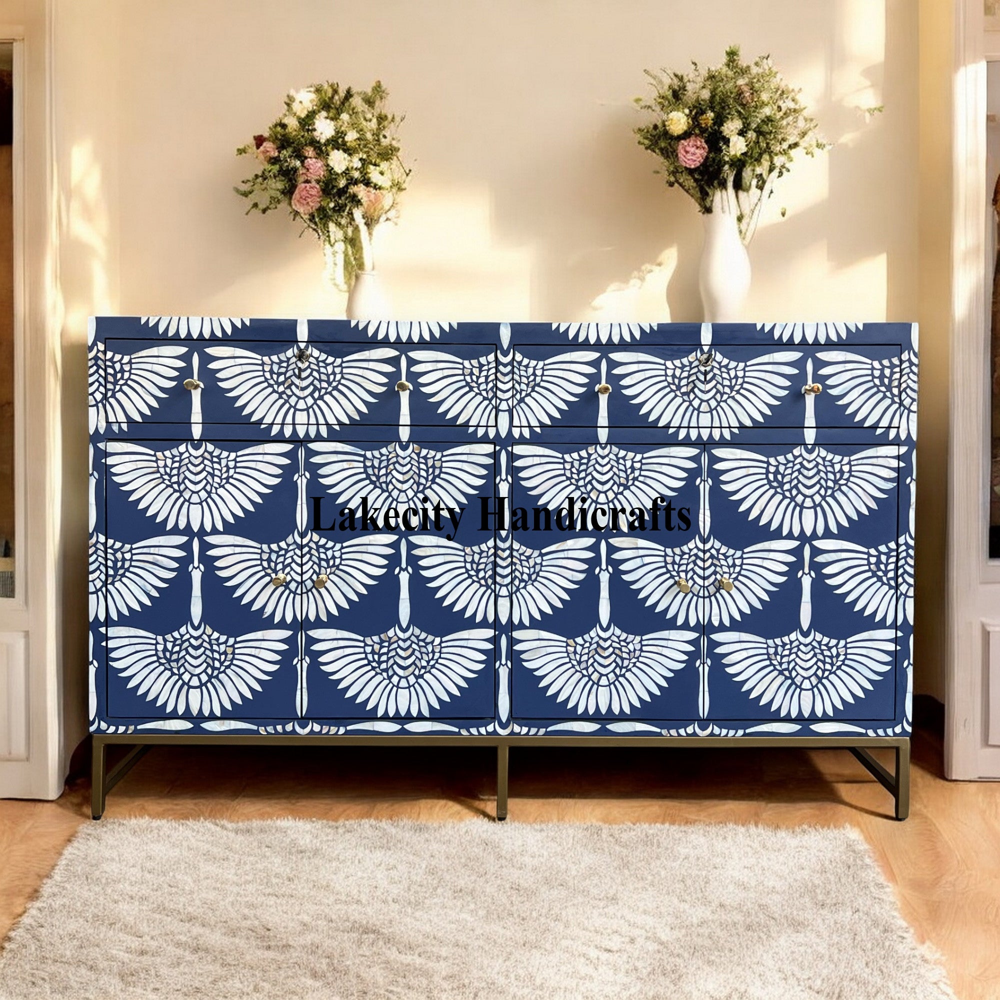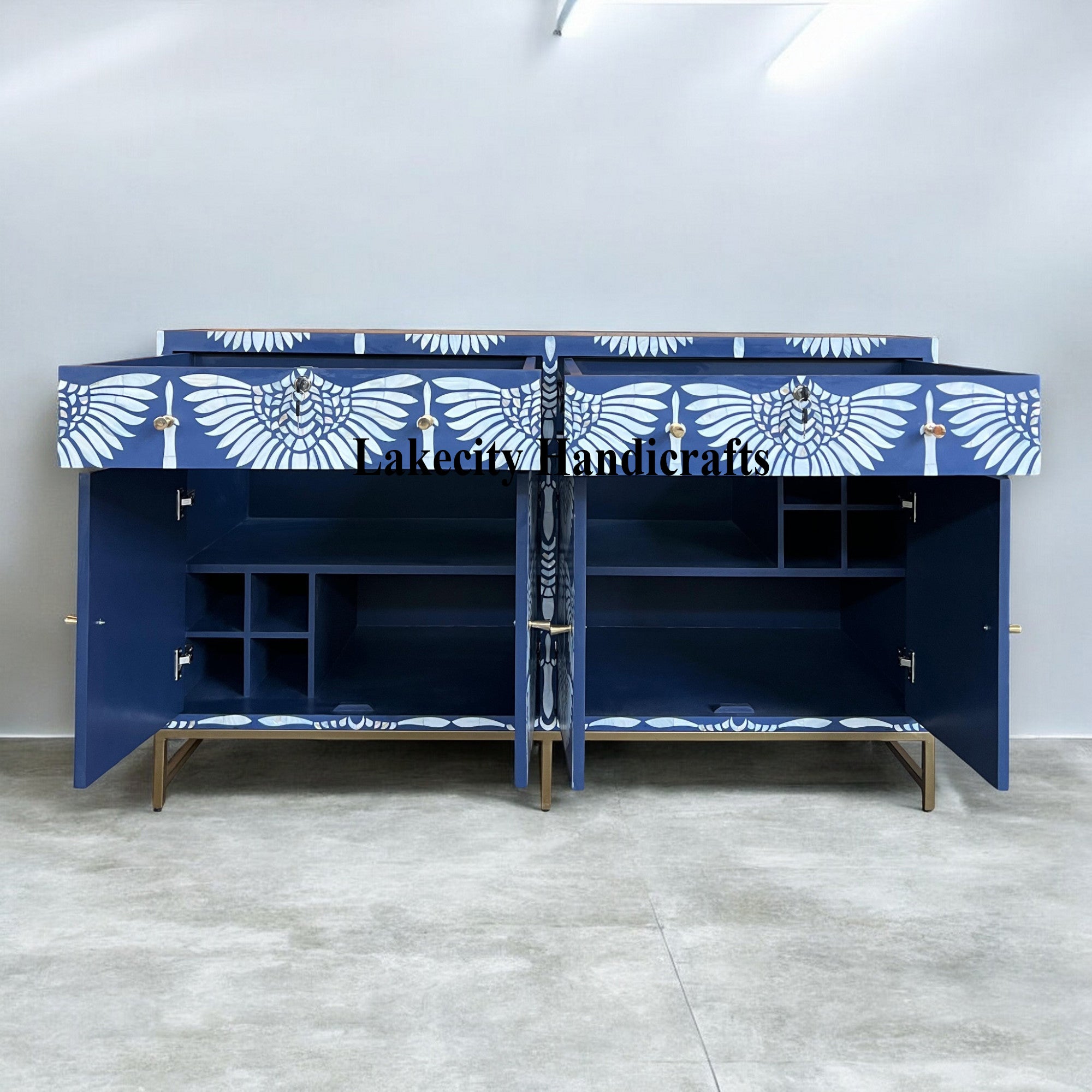 Bring home this ultra luxurious bar cabinet that comes with a glass top display. So, you can show off your precious items. Bright, bohemian, and filled with personality, this swan mop inlay bar cabinet is bound to become the main attraction of your home.