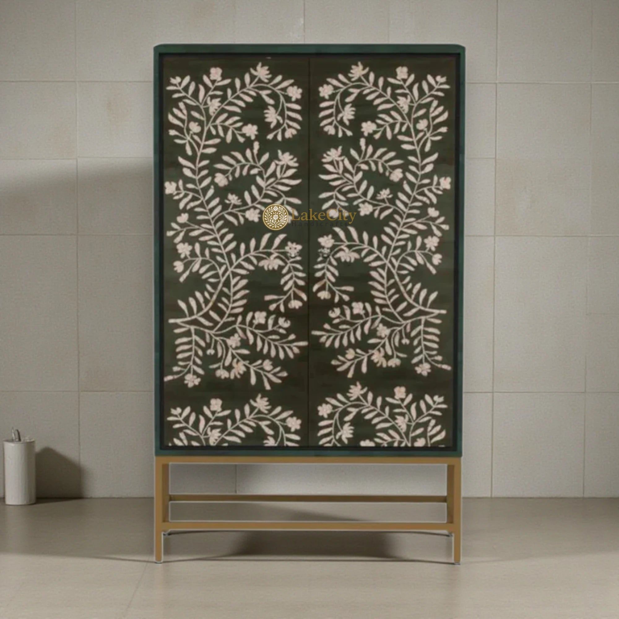 Elevate your entertaining space with this striking Mother of Pearl Flower Design Bar Cabinet. Featuring a sophisticated green finish and elegant two-door construction, this piece combines functionality with artistic craftsmanship. The glass-top display showcases your finest spirits and collectibles while the intricate mother-of-pearl inlay detailing adds bohemian charm and visual interest. Perfect for those who appreciate quality design and want a statement piece that reflects their refined taste. An investment in both style and storage that transforms any room into a curated showcase.