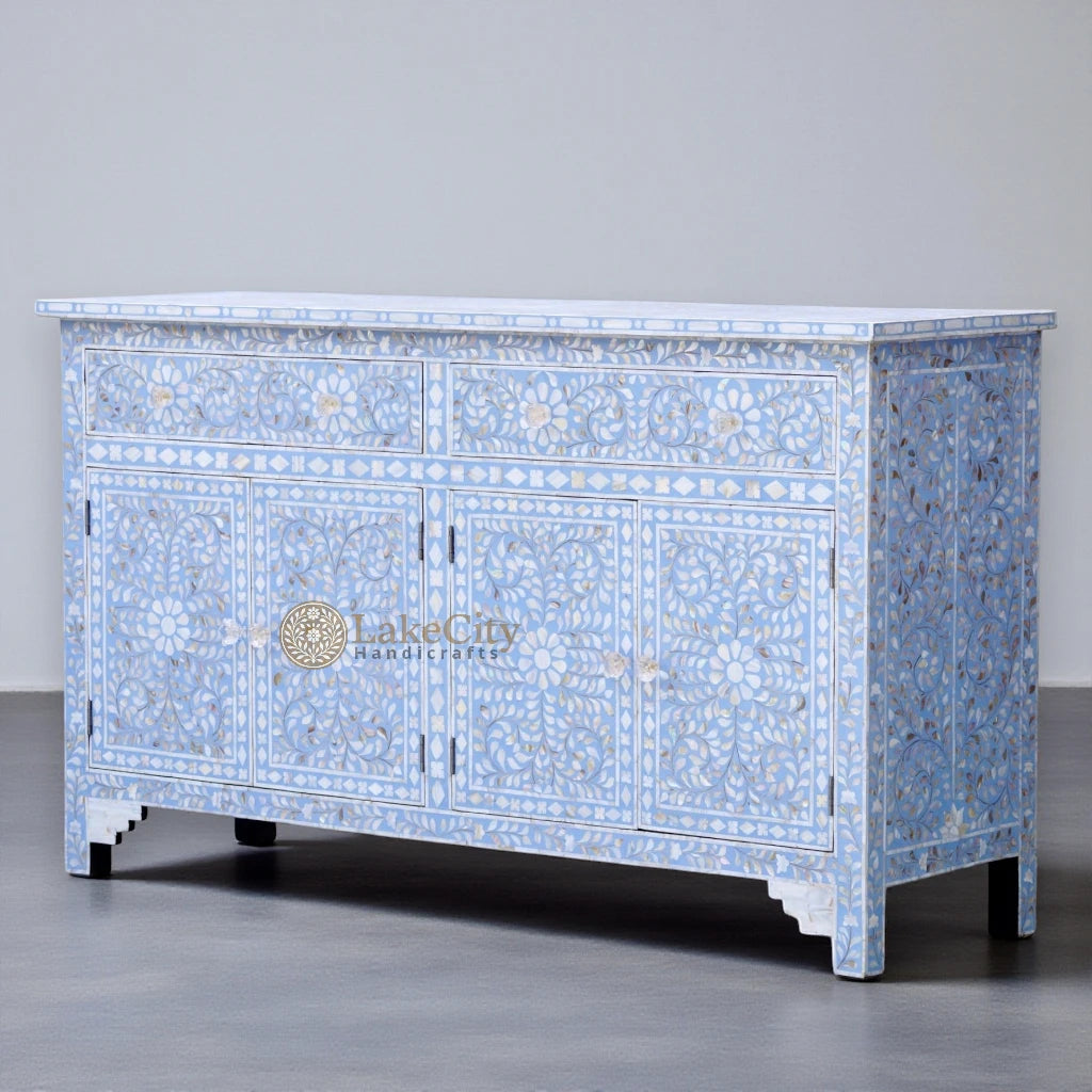 MOP Inlay sideboard in Floral Design is a classic piece of MOP Inlay handicraft that will instantly claim its place as an exquisite art in your interior space. It makes your living space authentically royal. This is the perfect interior feature for your home.