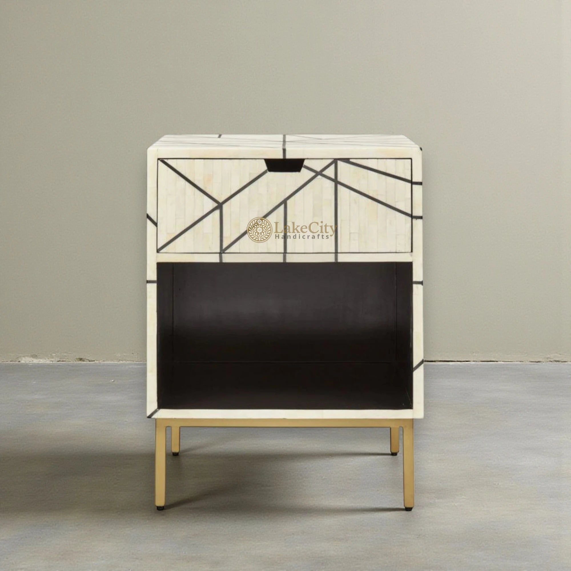 Our bone inlay Bedside will complement existing bedroom furnishings and add that unique character to your peaceful space! Consisting of 1 drawer for ample bedside storage, it is lovingly created with the use of bone inlay and resin to cleverly design whichever exquisite pattern for you.