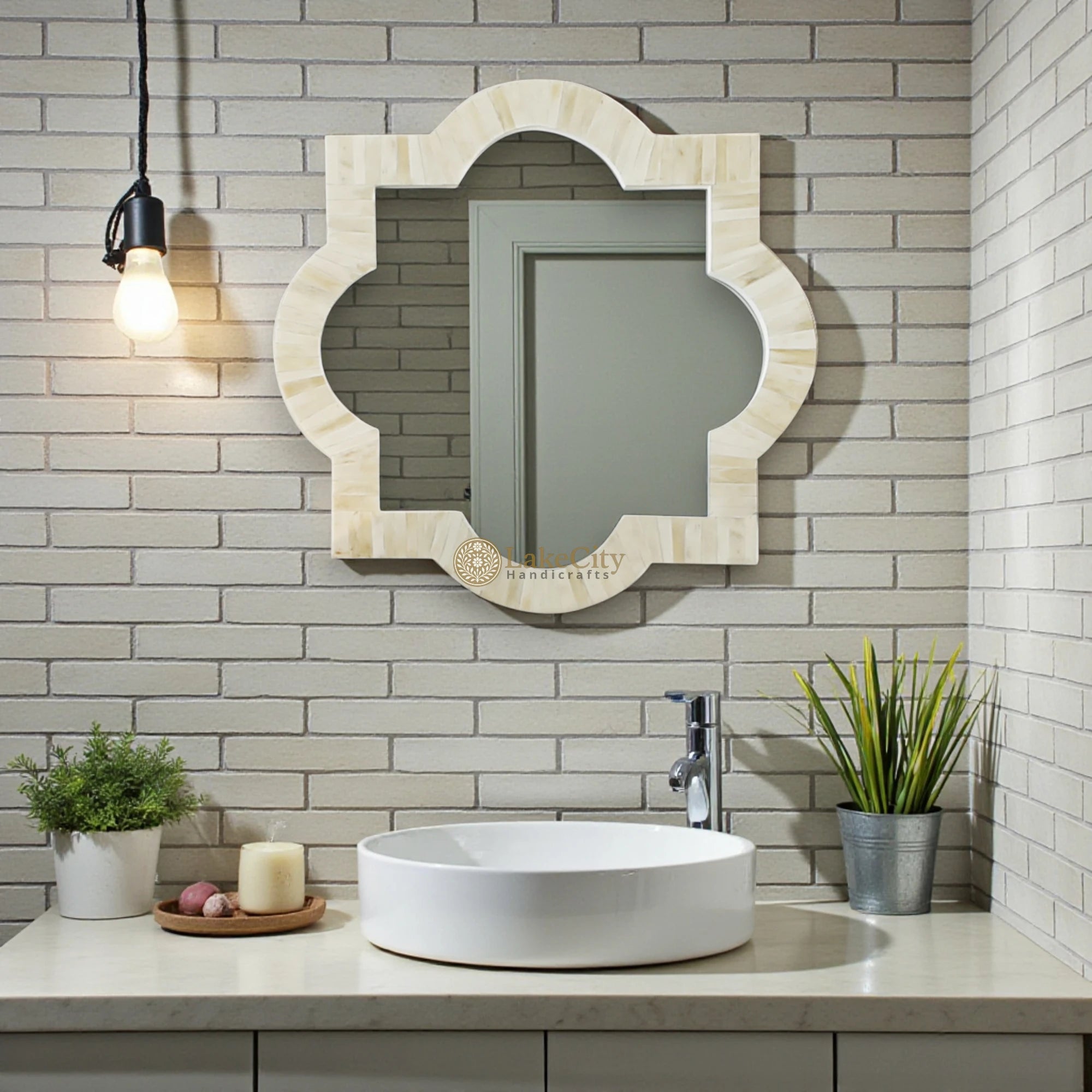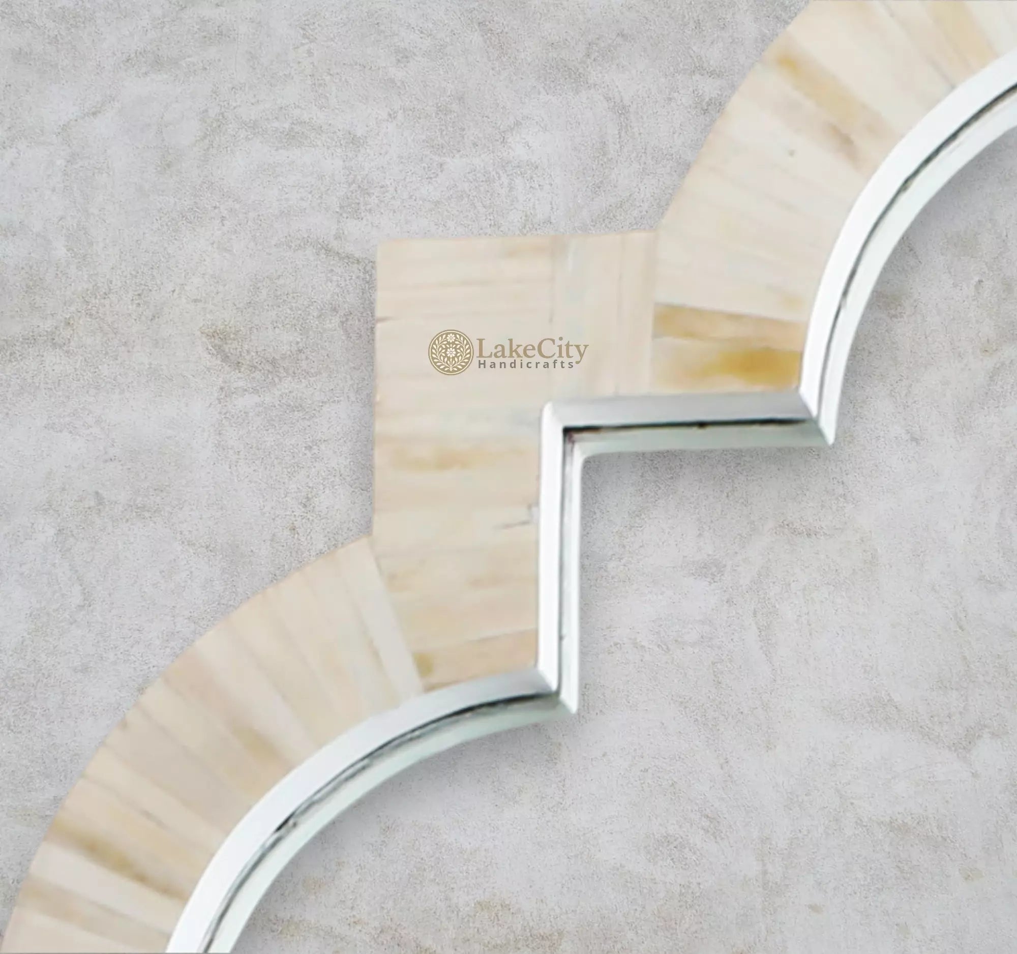 Add an exotic element to your home with this stunning Indian Quatrefoil Bone Inlay Mirror in natural bone. This mirror has a beautiful frame made from natural bone inlay pieces.