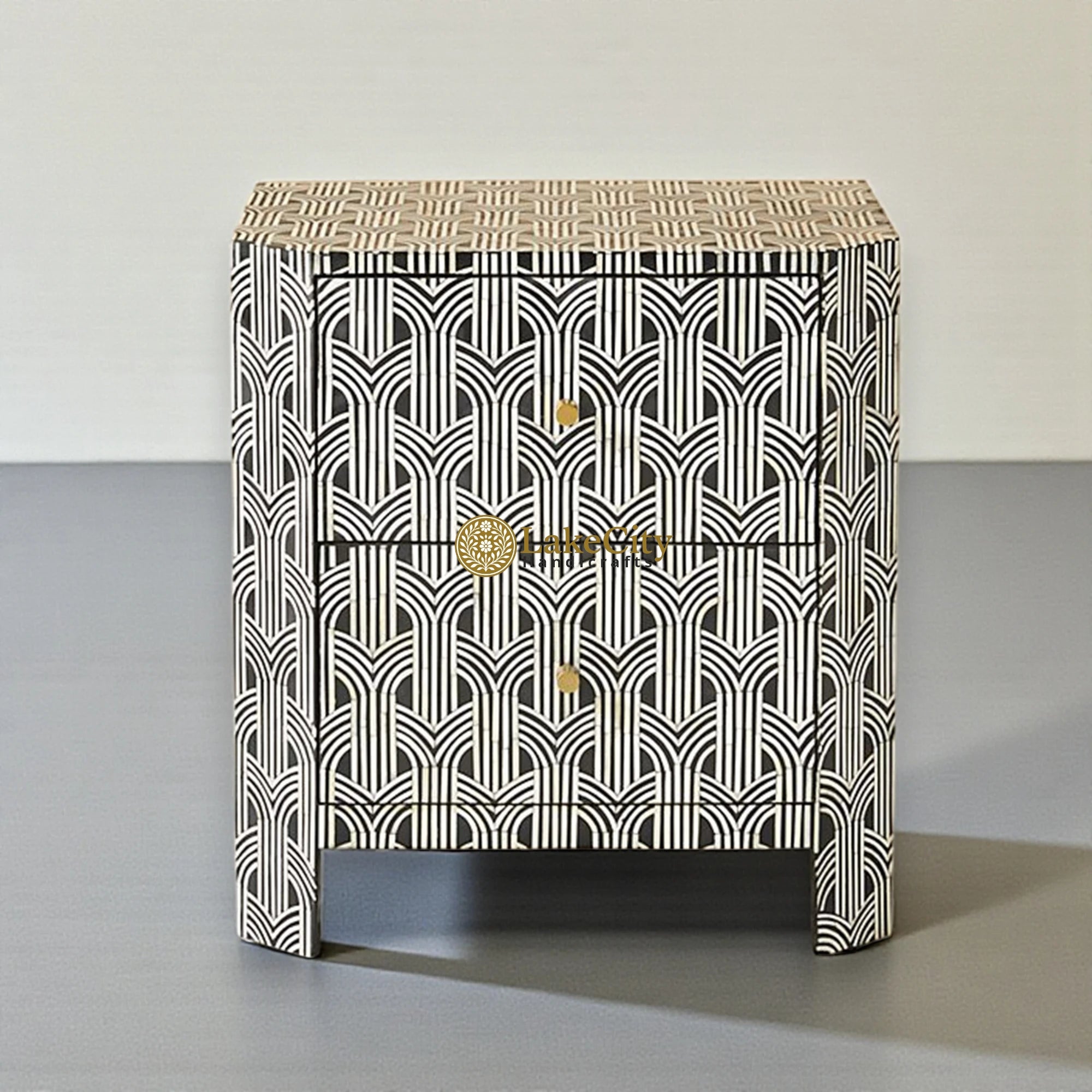 With an intricate handcrafted bone inlay in a stylized Art Deco pattern, this chic nightstand is a standout piece for any interior - from a midtown master bedroom with city views, to an eclectic guest room.