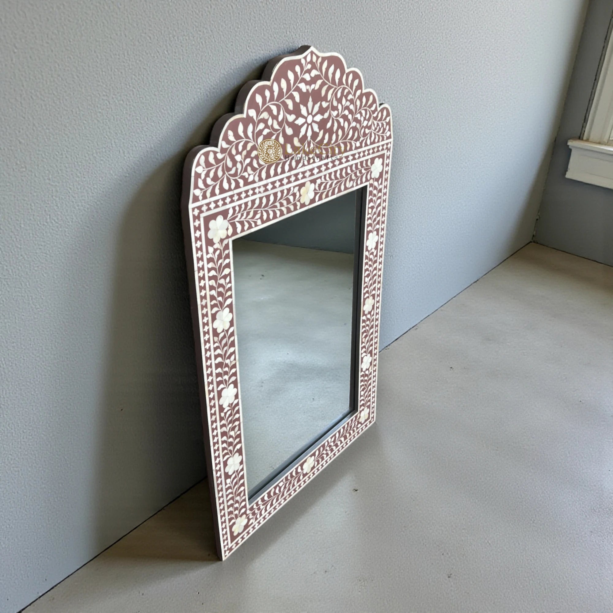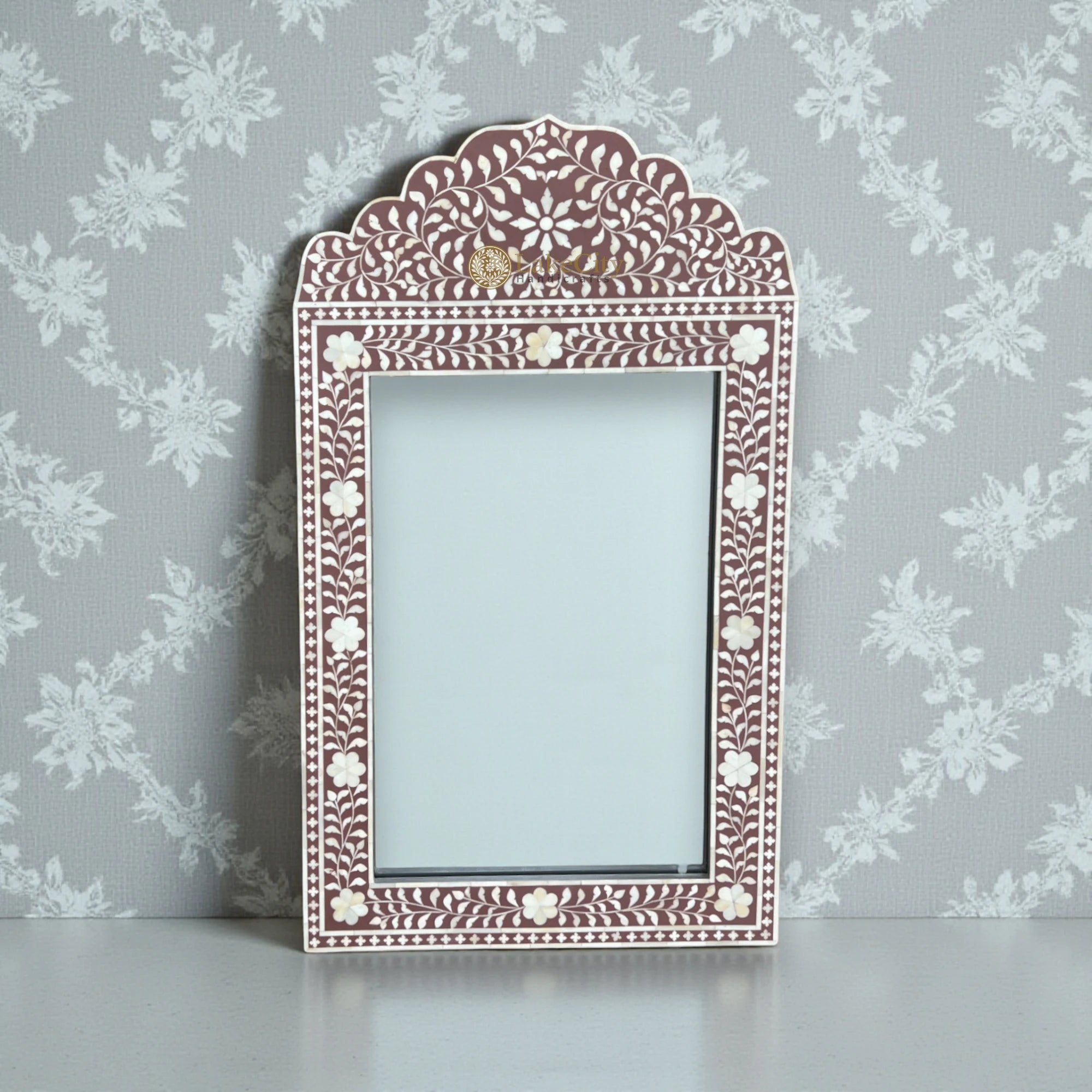 Bone Inlay Floral Design Crested Mirror Frame Brown