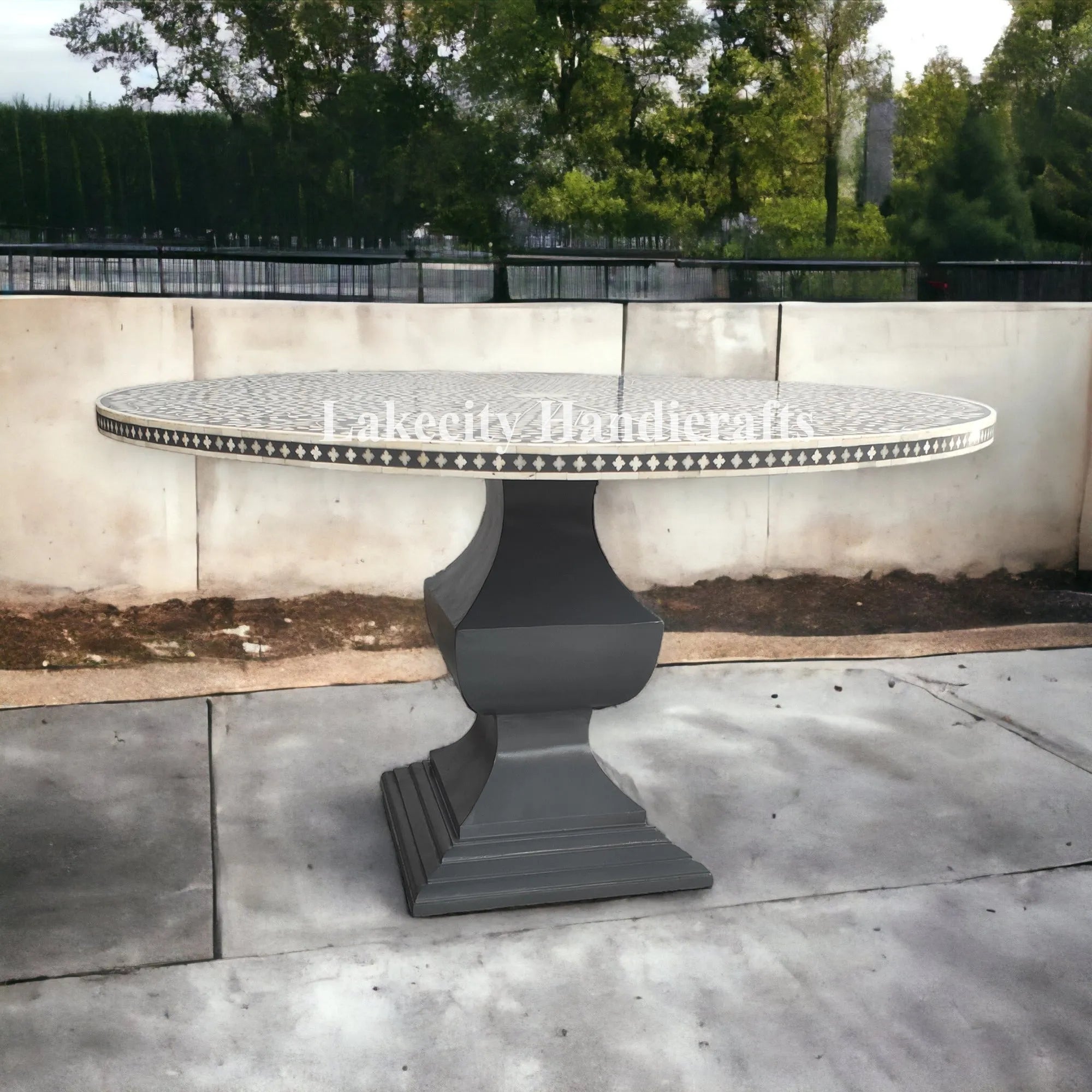 Create a dining space that you and your guests will adore with the stunning Bone inlay dining table. The table features a patterned bone inlay top that resembles ivory fauna stretching across a black backdrop. This Dining Table ensures your dining area makes a true impression.