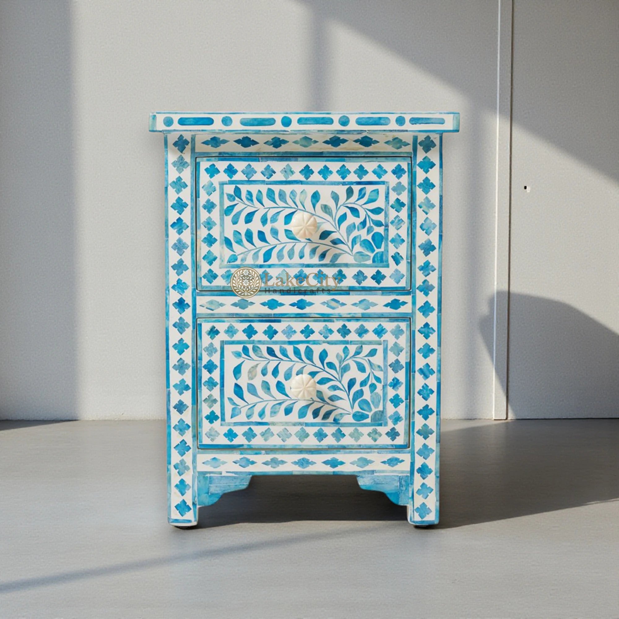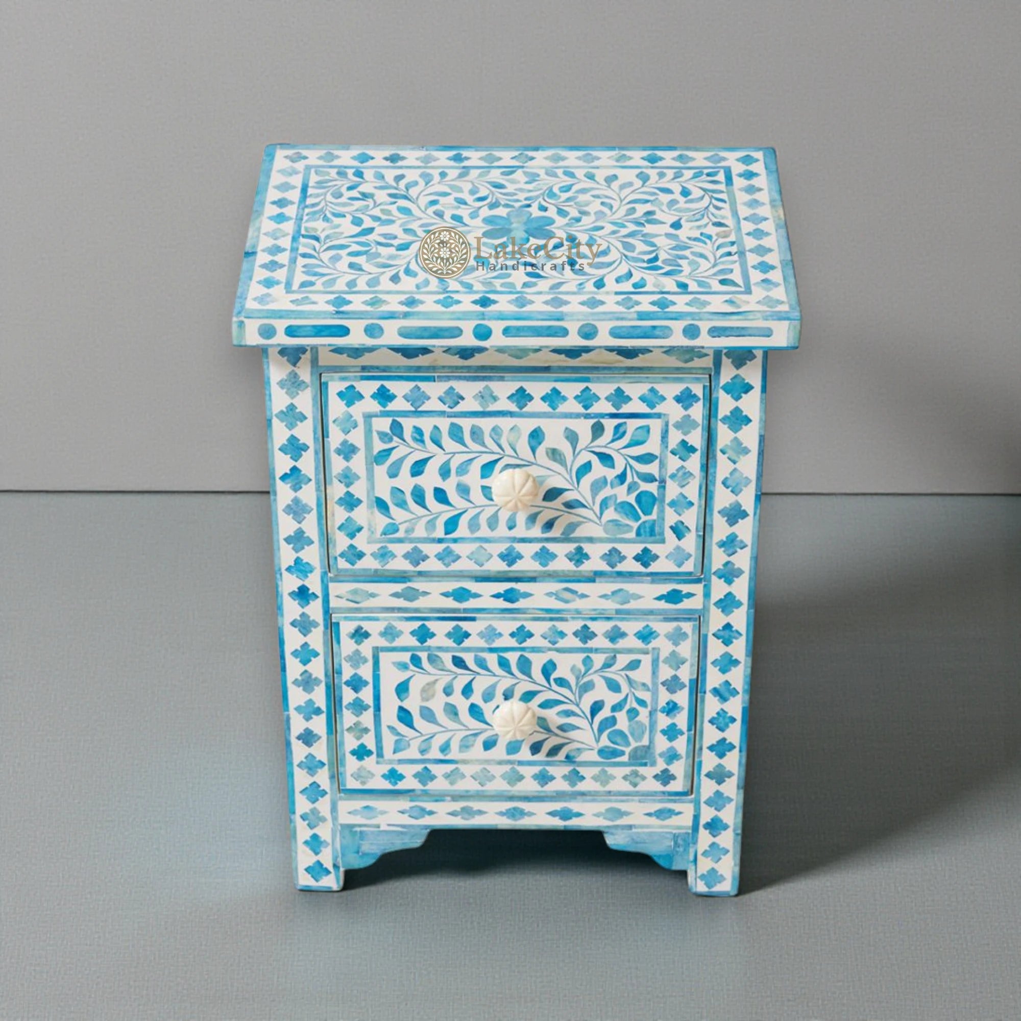 A Lakecity Handicrafts exclusive! A gorgeous transposition of the classic bone inlay furniture. Intricately carved pieces of bone in a floral motif are dyed a vibrant turquoise hue before being inlaid on a white resin base. This is a conversation starter for sure!