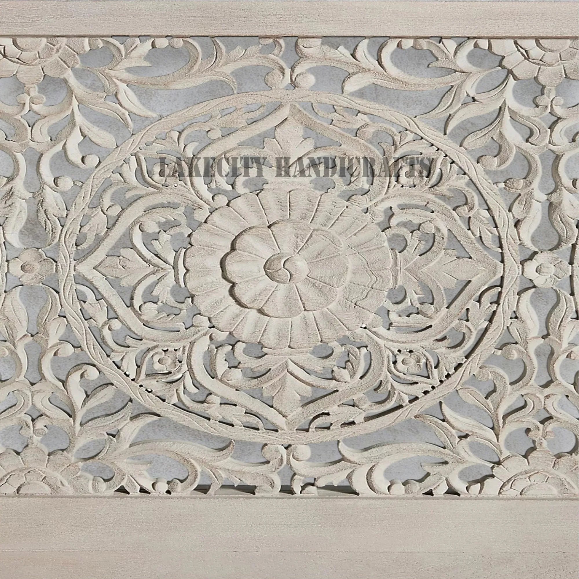 | Hand-carved tropical hardwood bed with a medallion patterned headboard in a natural, white-washed, or indigo finish |