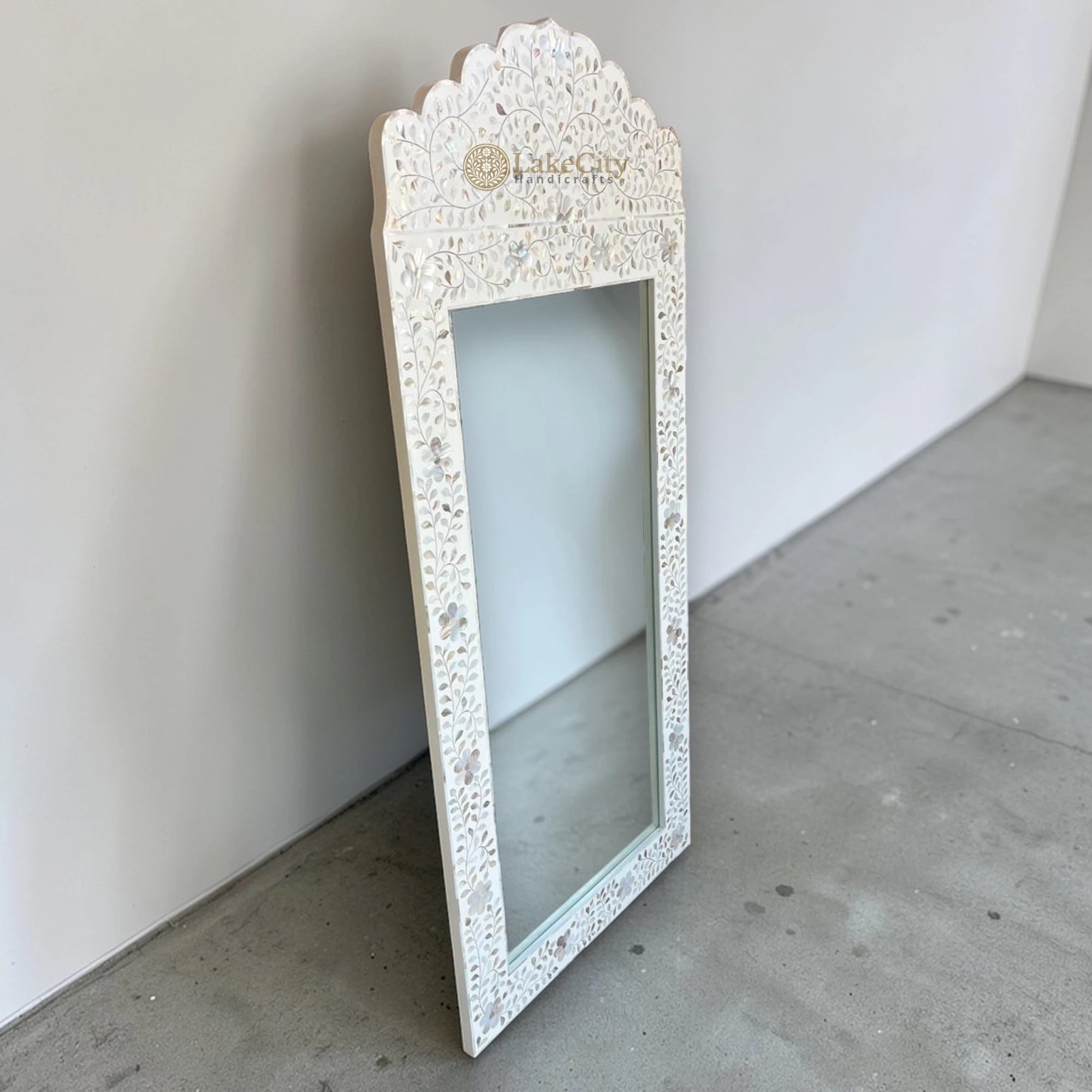Mother of Pearl Inlay Floral Crested Mirror White: A breathtaking blend of hand-carved solid wood and shimmering ivory shell. This "jewelry for your walls" reflects natural light to make any room feel larger and more serene. A fresh, artisanal statement of luxury and light.
