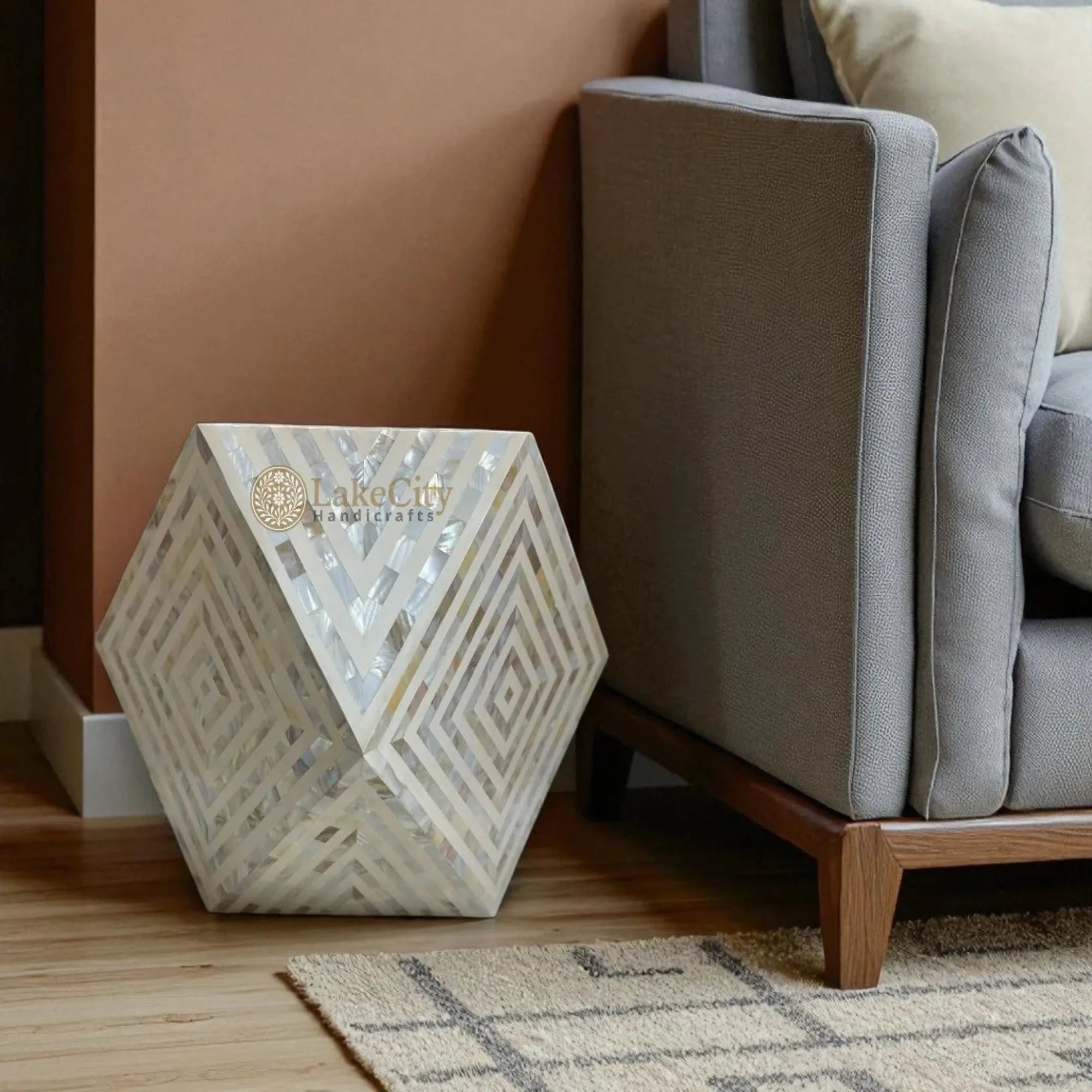 Bold, pearlescent, and geometric, this is a conversation starter for sure. Functions both as a seat or a side table.